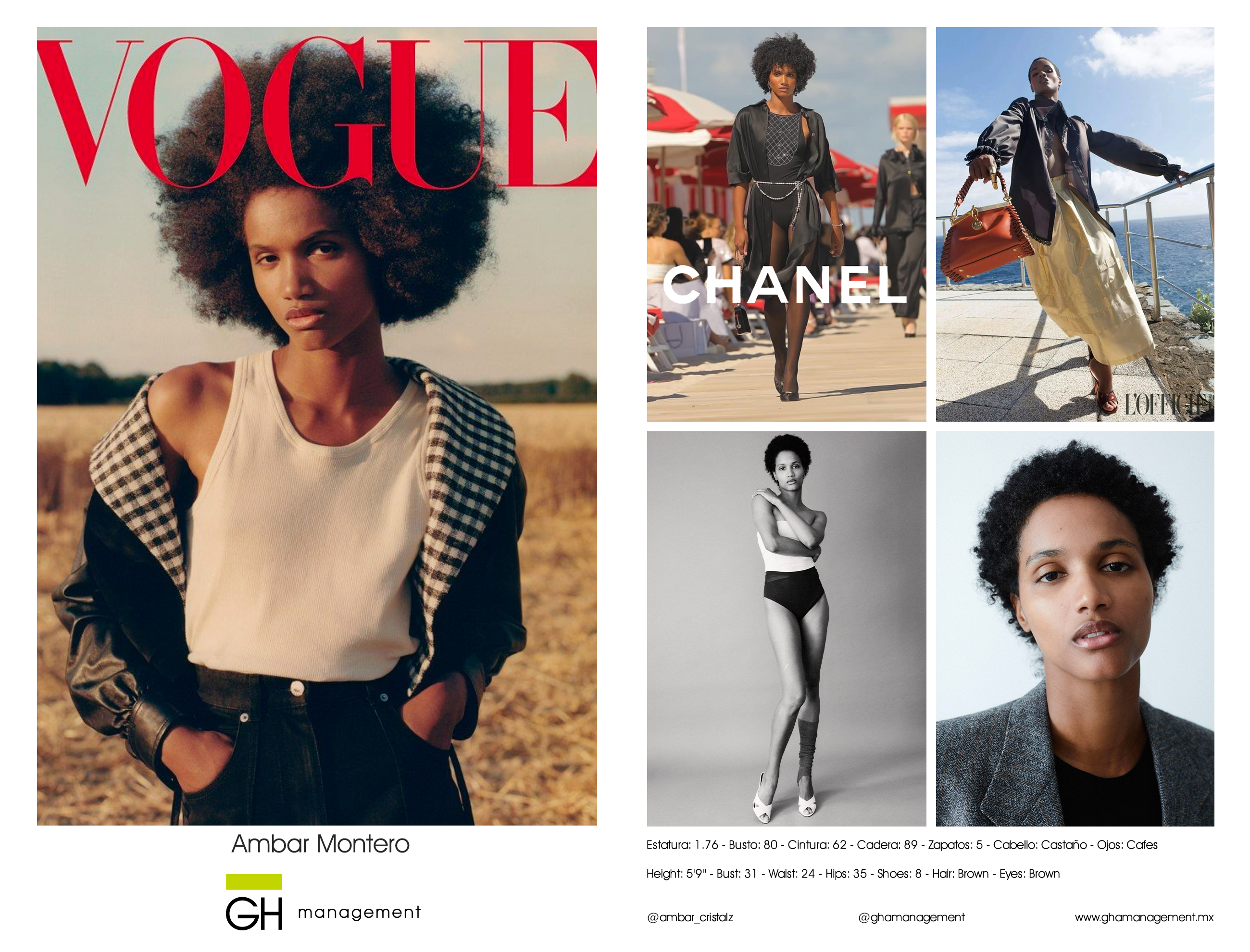 Estatura: 1.76 - Busto: 80 - Cintura: 62 - Cadera: 89 - Zapatos: 5 - Cabello: CastaƱo - Ojos: Cafes