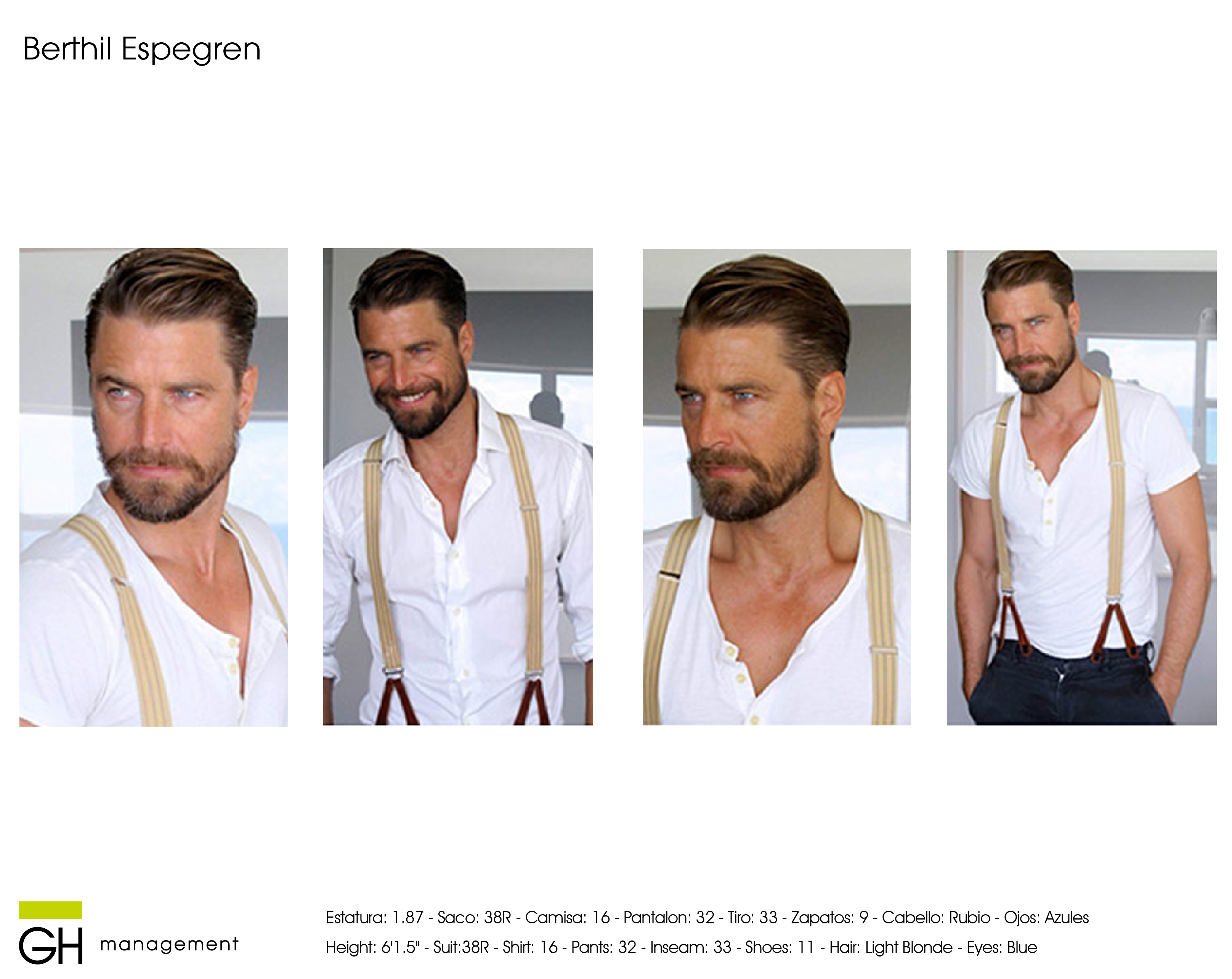 Estatura: 1.87 - Saco: 38R - Camisa: 16 - Pantalon: 32 - Tiro: 33 - Zapatos: 9 - Cabello: Rubio - Ojos: Azules