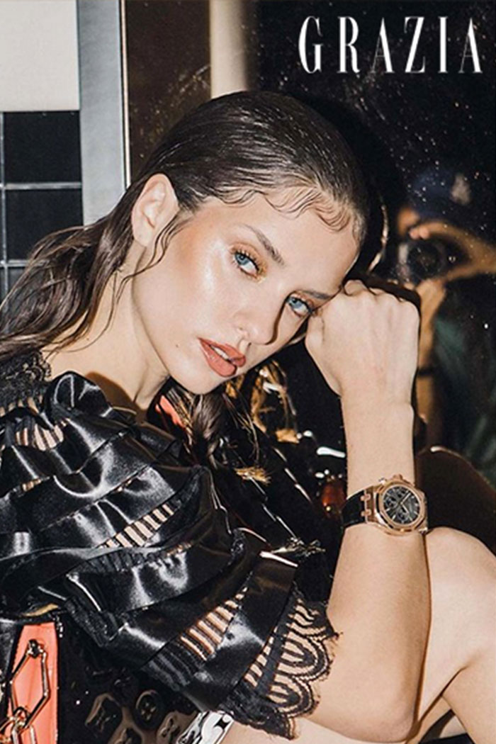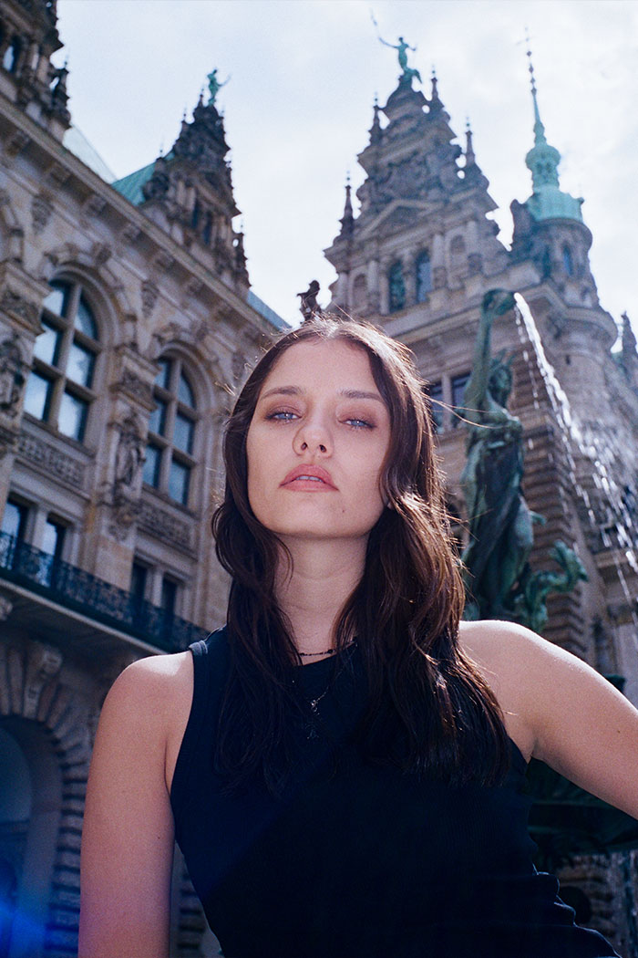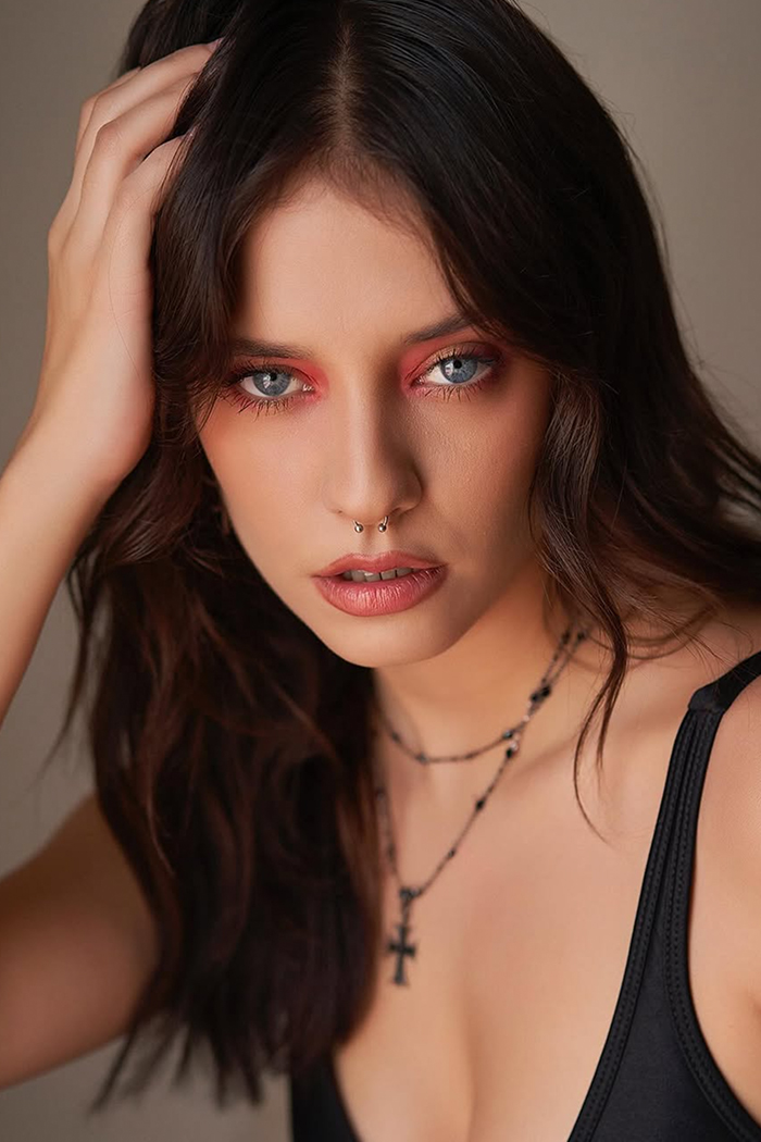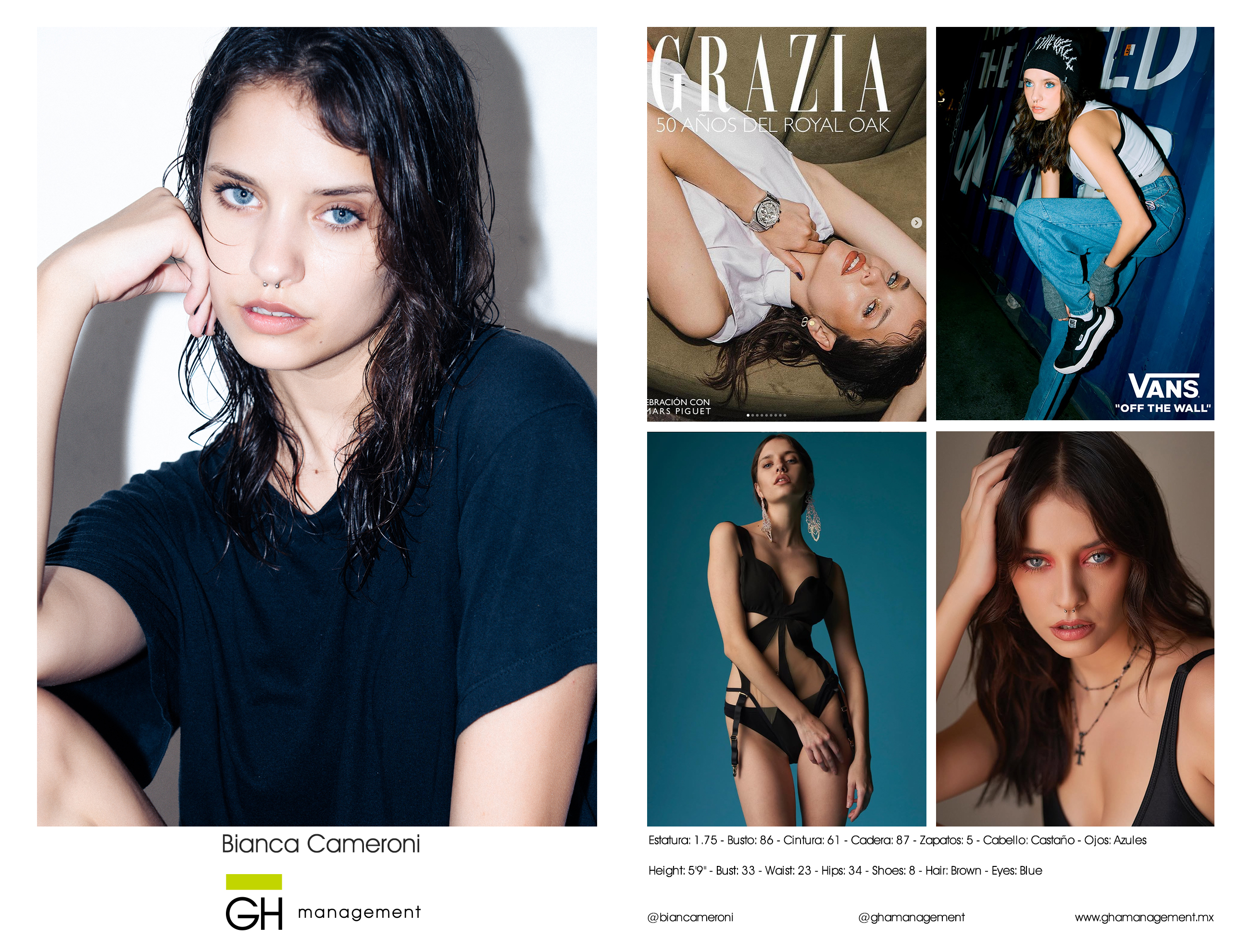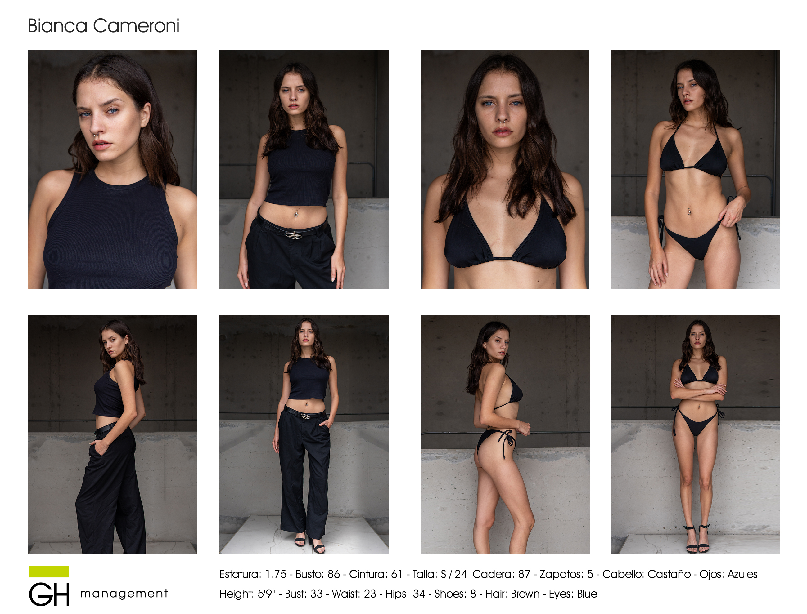 Estatura: 1.75 - Busto: 86 - Cintura: 61 - Cadera: 87 - Zapatos: 5 - Cabello: CastaƱo - Ojos: Azules