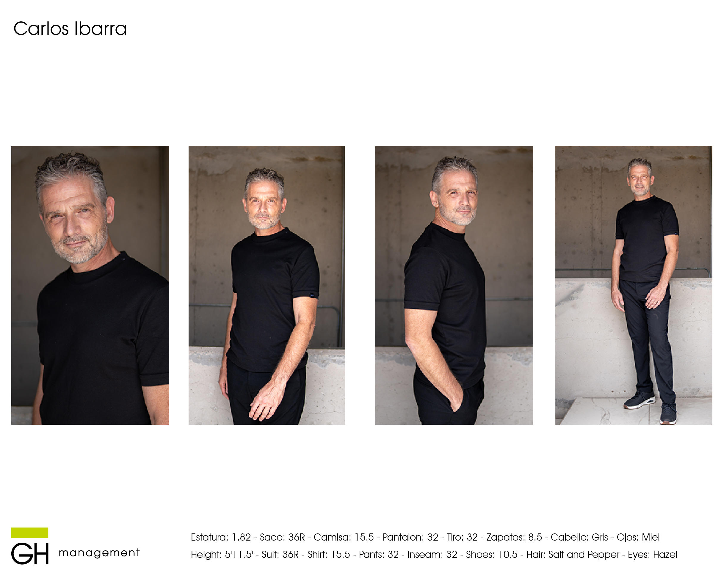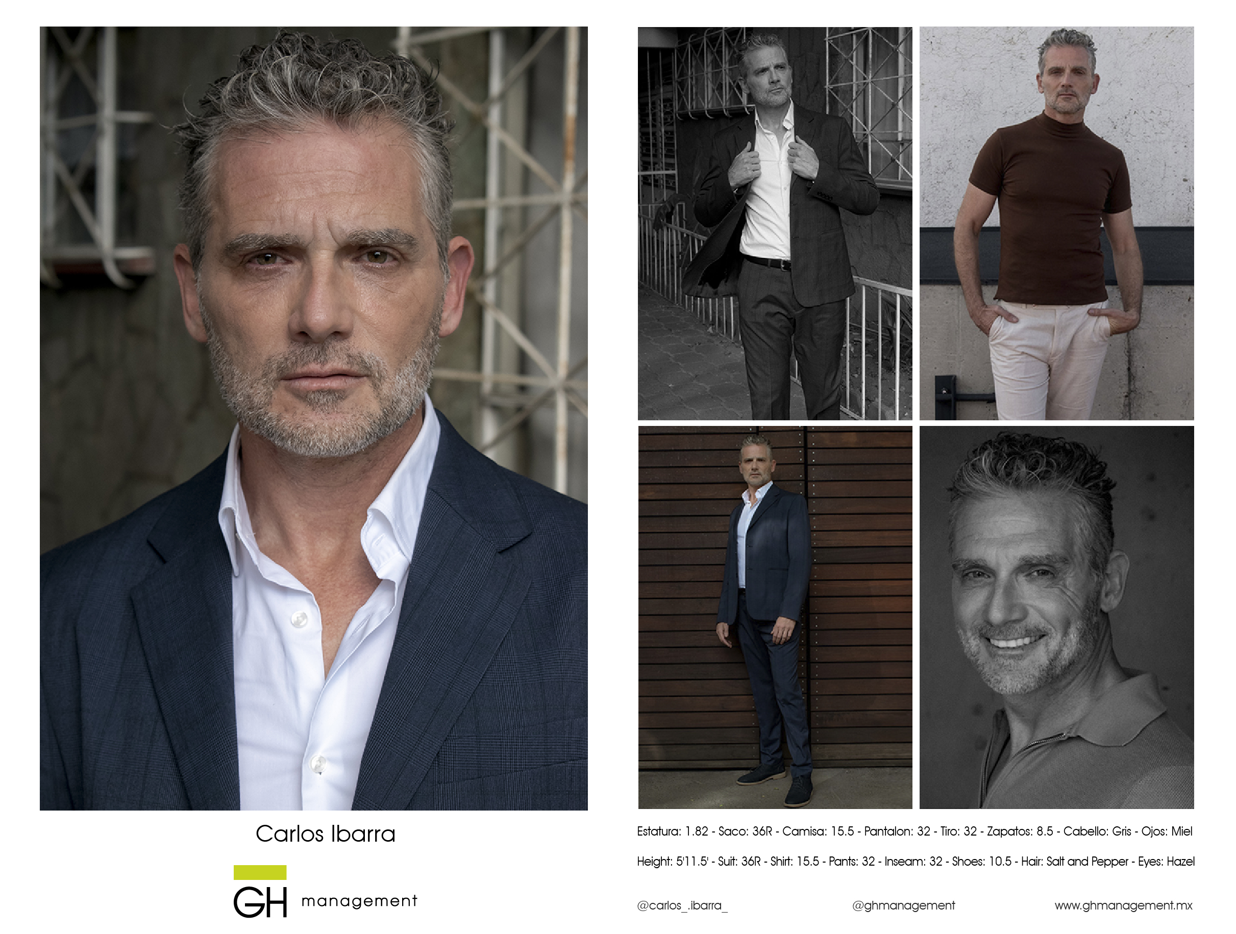 Estatura: 1.82 - Saco: 36R - Camisa: 15.5 - Pantalon: 32 - Tiro: 32 - Zapatos: 8.5 - Cabello: Gris - Ojos: Miel