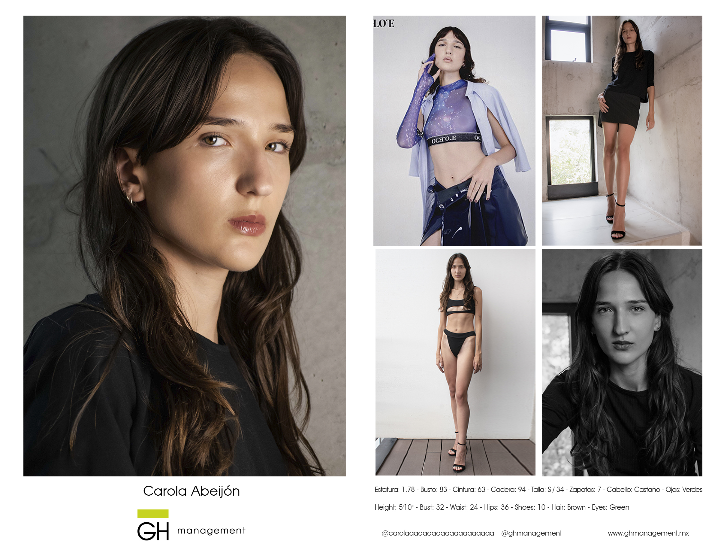 Estatura: 1.78 - Busto: 83 - Cintura: 63 - Cadera: 94 - Zapatos: 7 - Cabello: CastaƱo - Ojos: Verdes