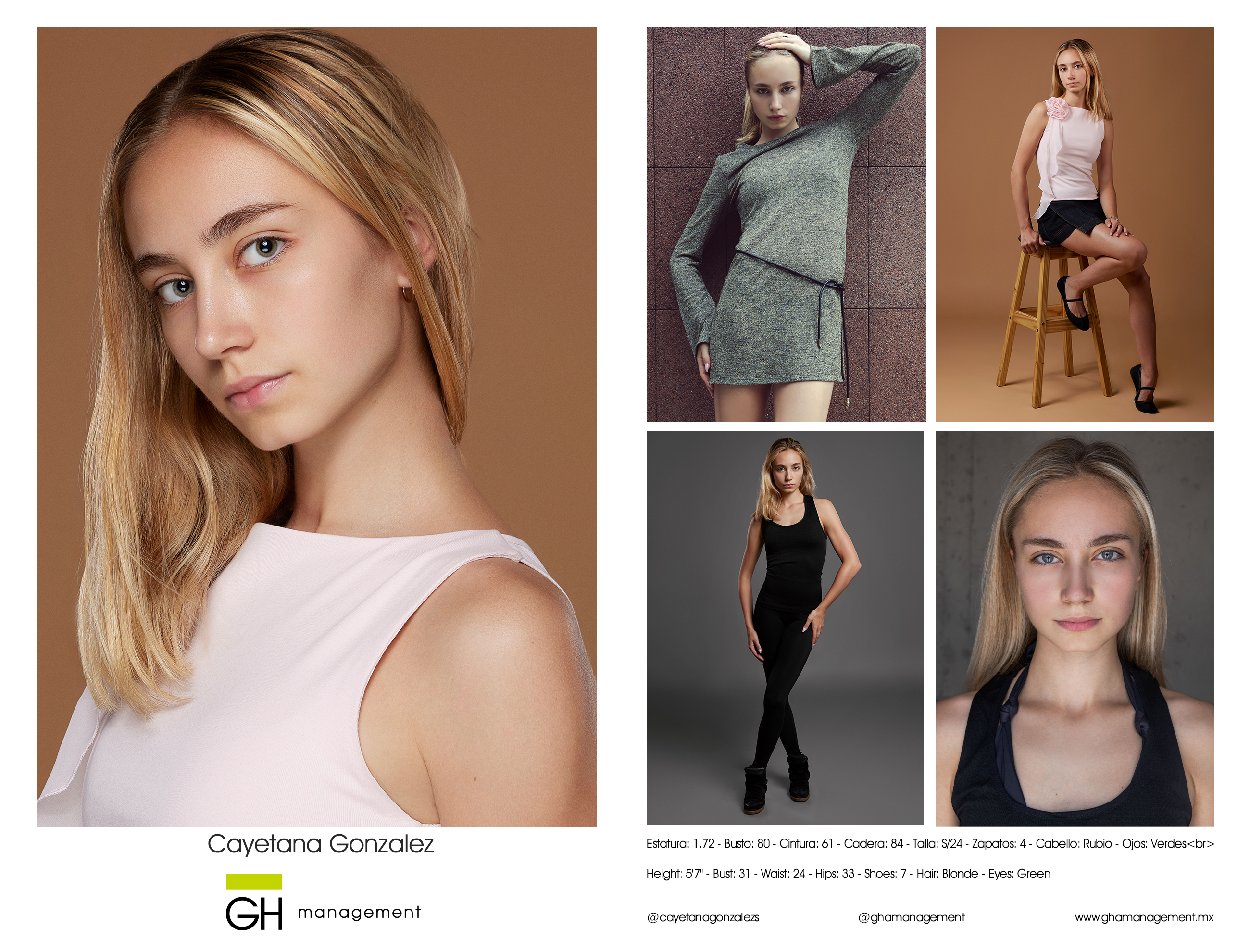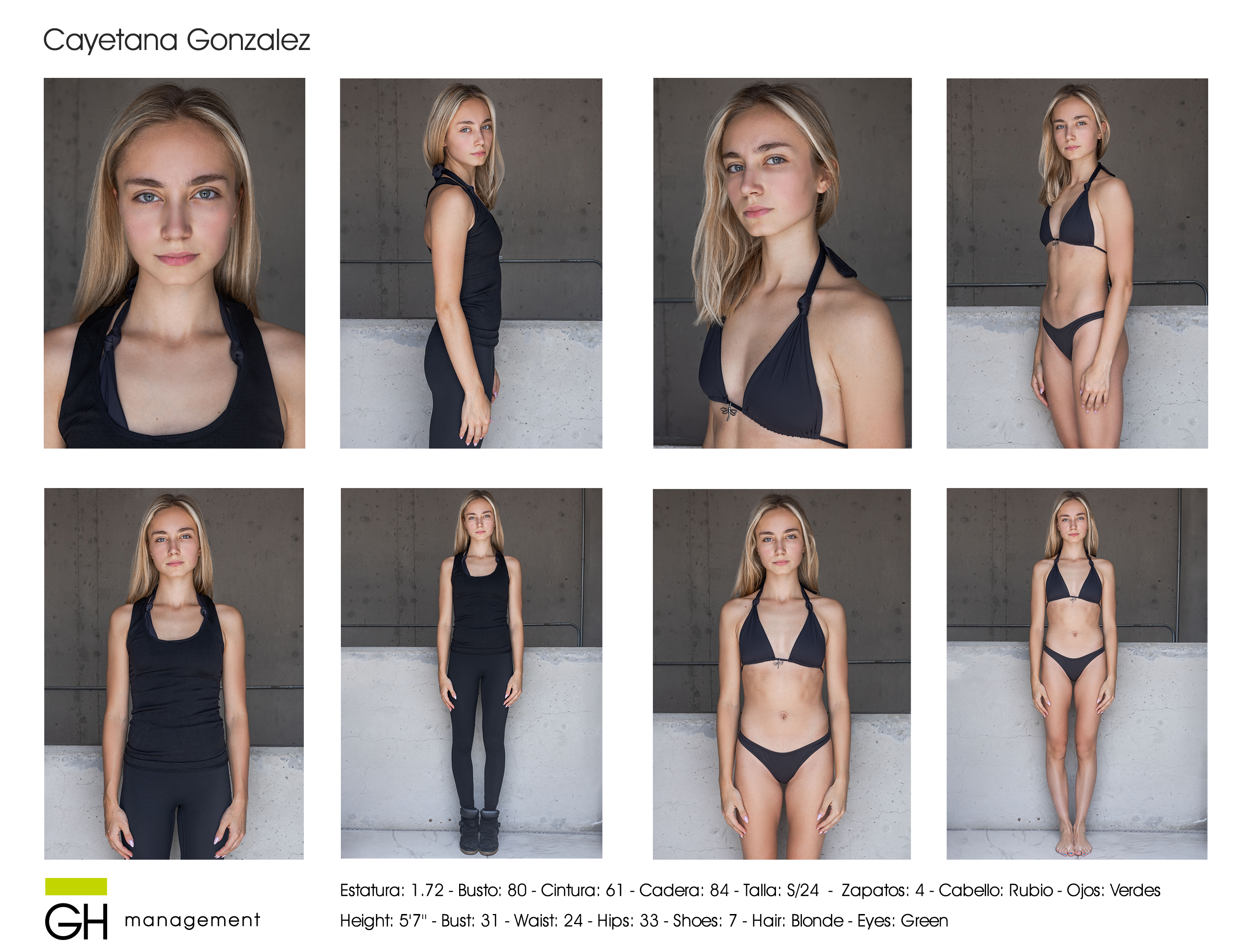 Estatura: 1.72 - Busto: 80 - Cintura: 61 - Cadera: 84 - Zapatos: 4 - Cabello: Rubio - Ojos: Verdes