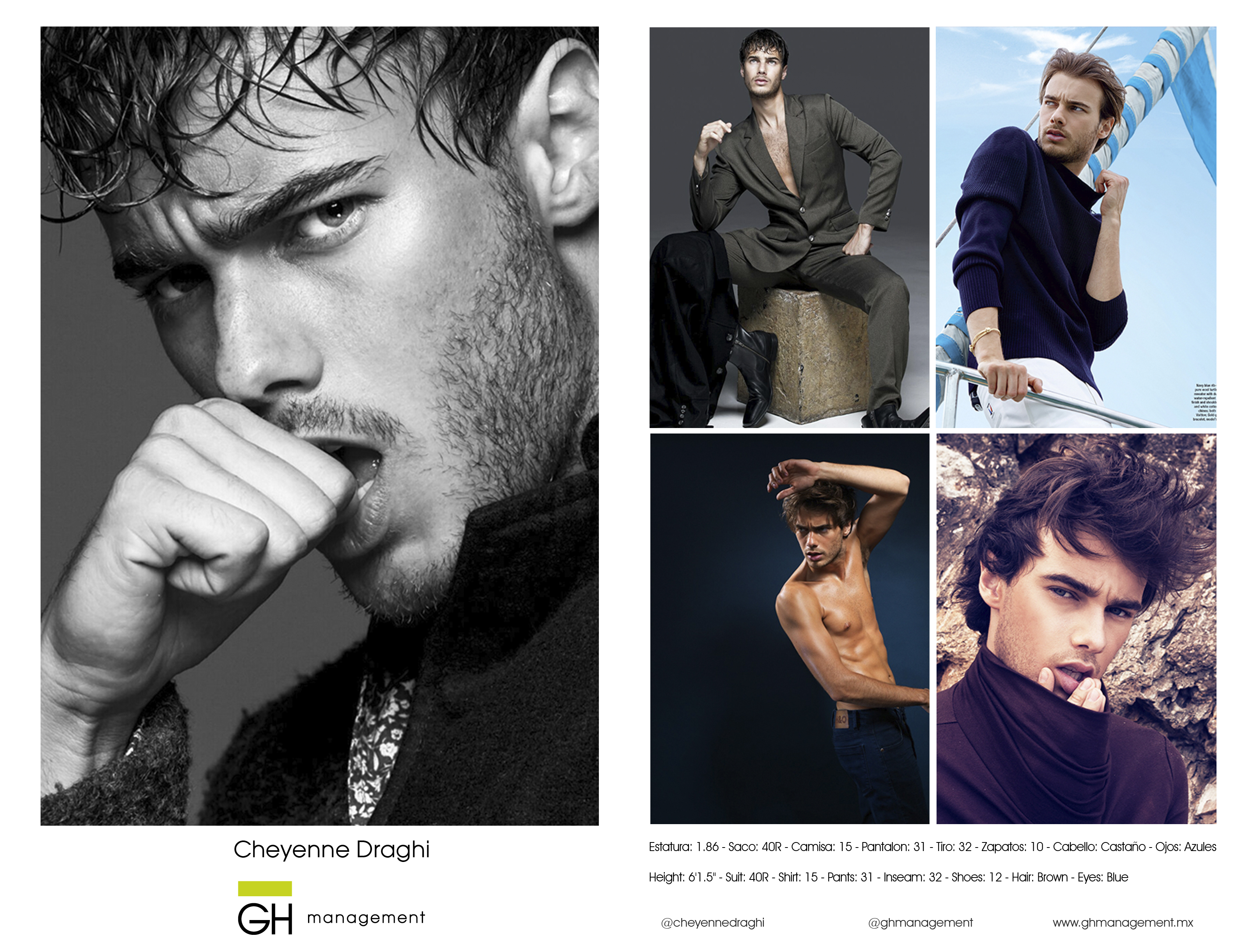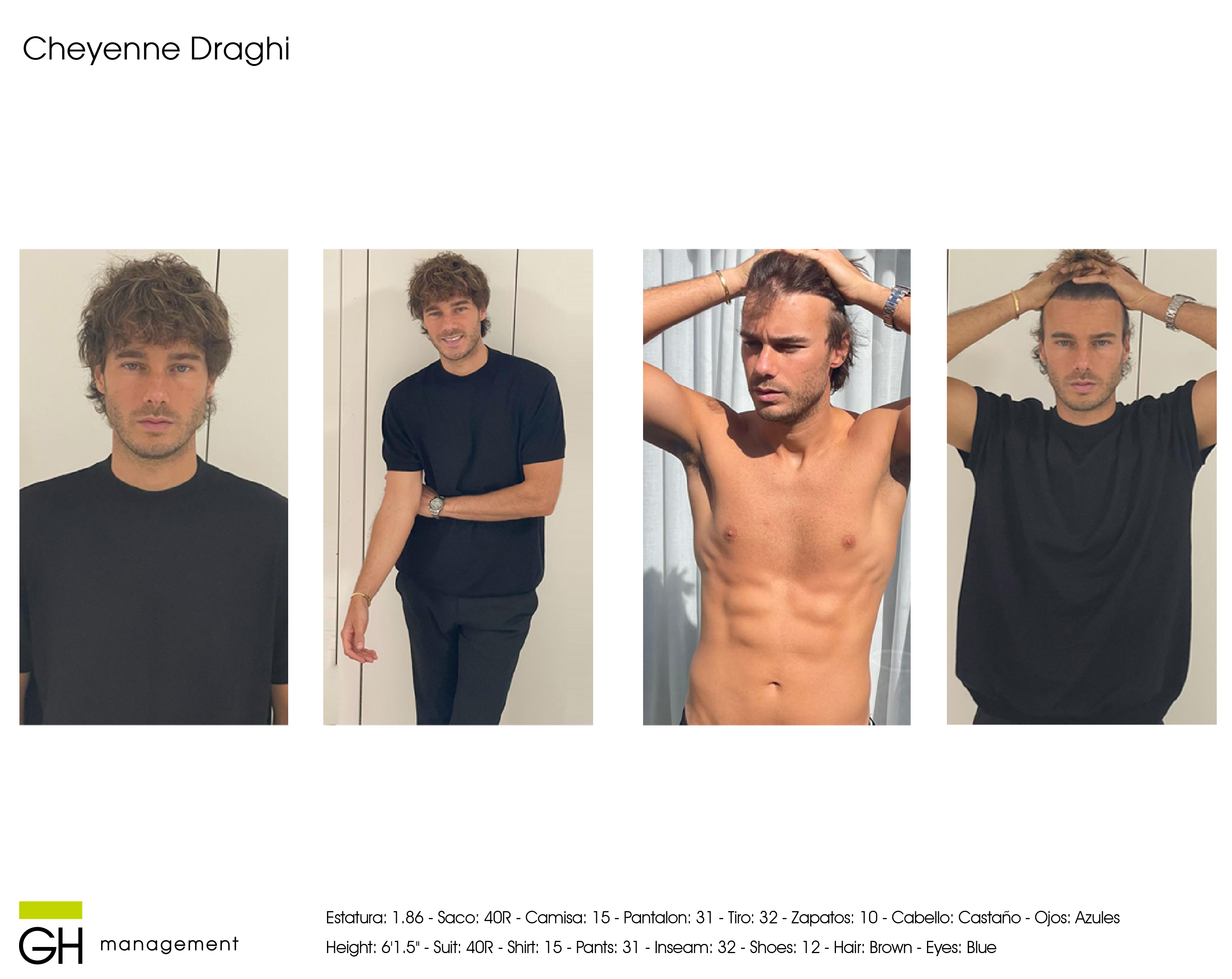 Estatura: 1.86 - Saco: 40R - Camisa: 15 - Pantalon: 31 - Tiro: 32 - Zapatos: 10 - Cabello: CastaƱo - Ojos: Azules
