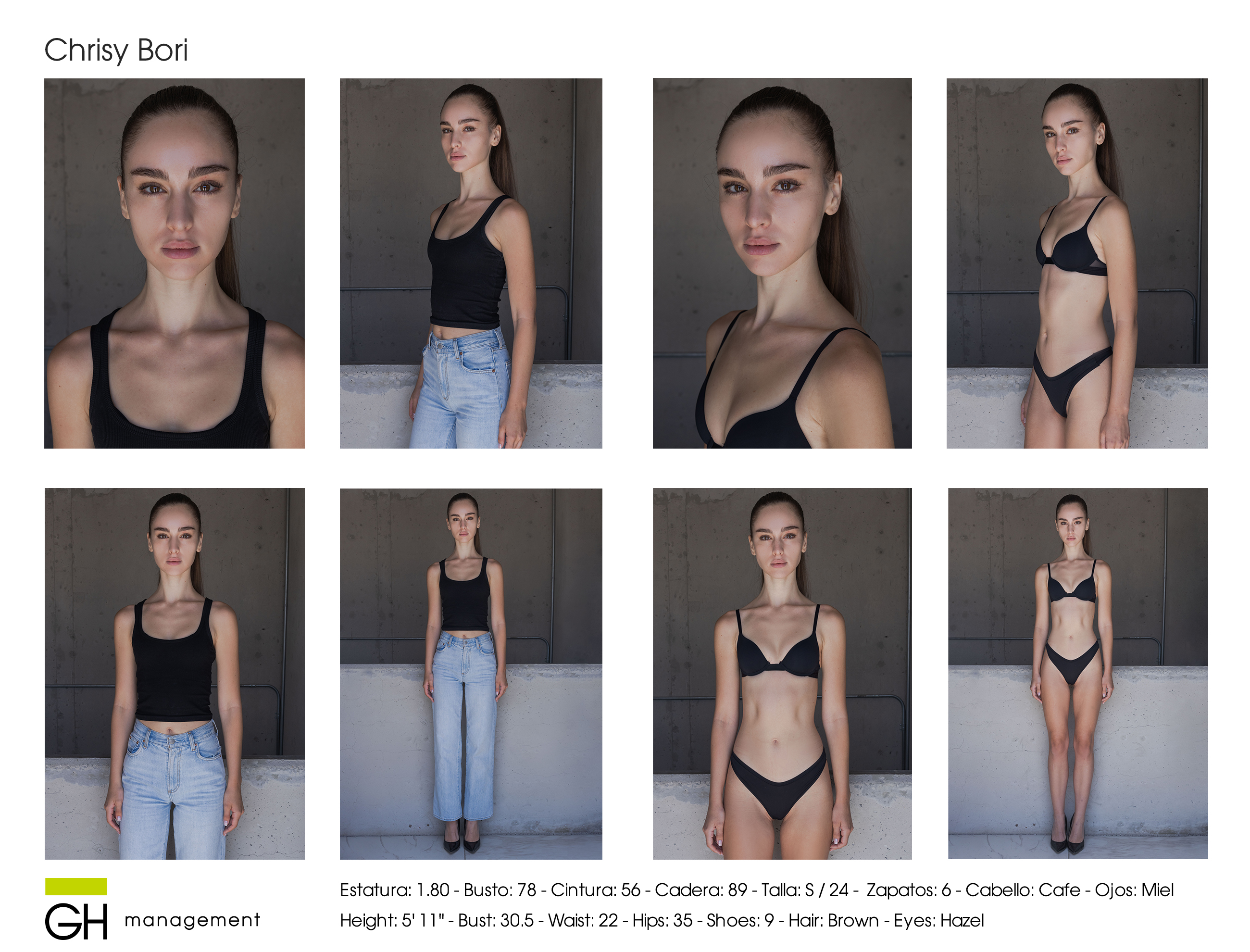 Estatura: 1.80 - Busto: 78 - Cintura: 56- Cadera: 89 - Zapatos: 6- Cabello: Cafe - Ojos: Miel