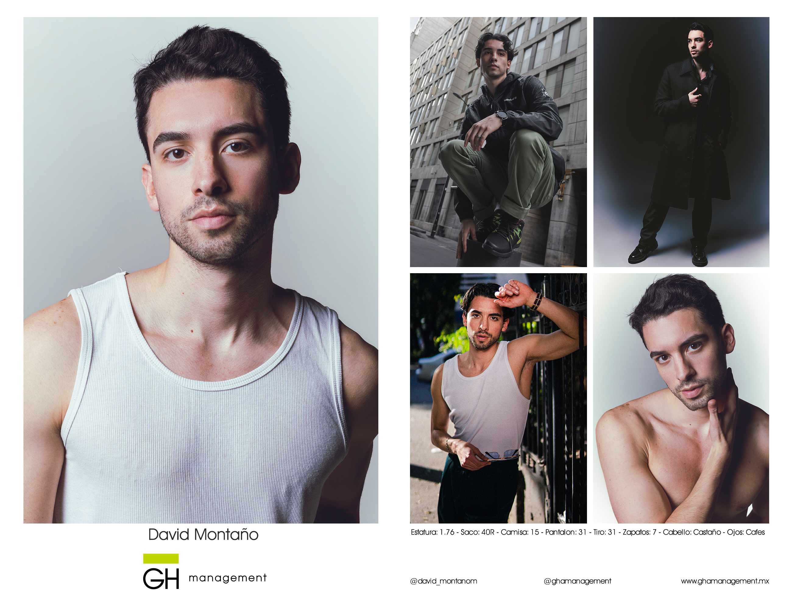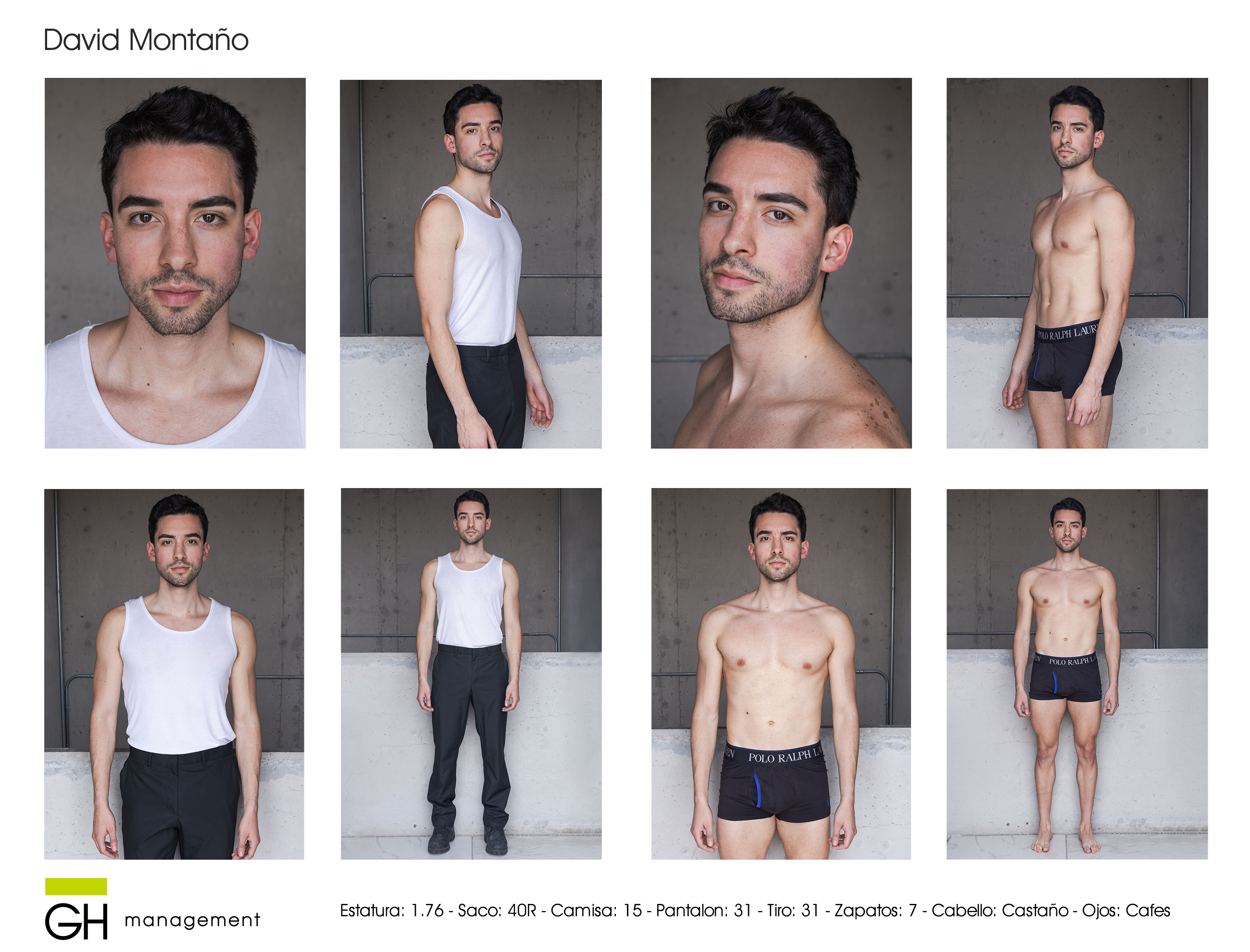 Estatura: 1.76 - Saco: 40R - Camisa: 15 - Pantalon: 31 - Tiro: 31 - Zapatos: 7 - Cabello: Castaño - Ojos: Cafes