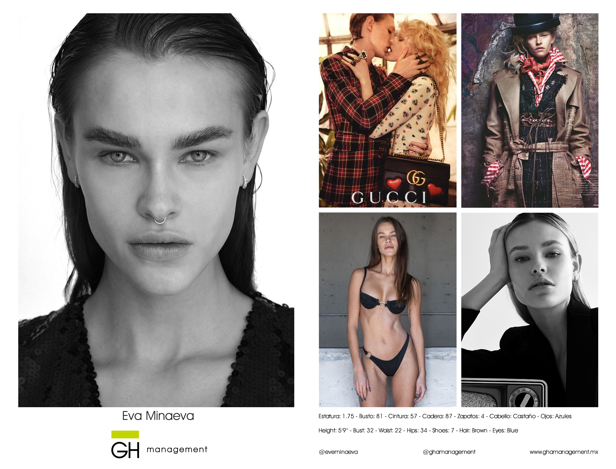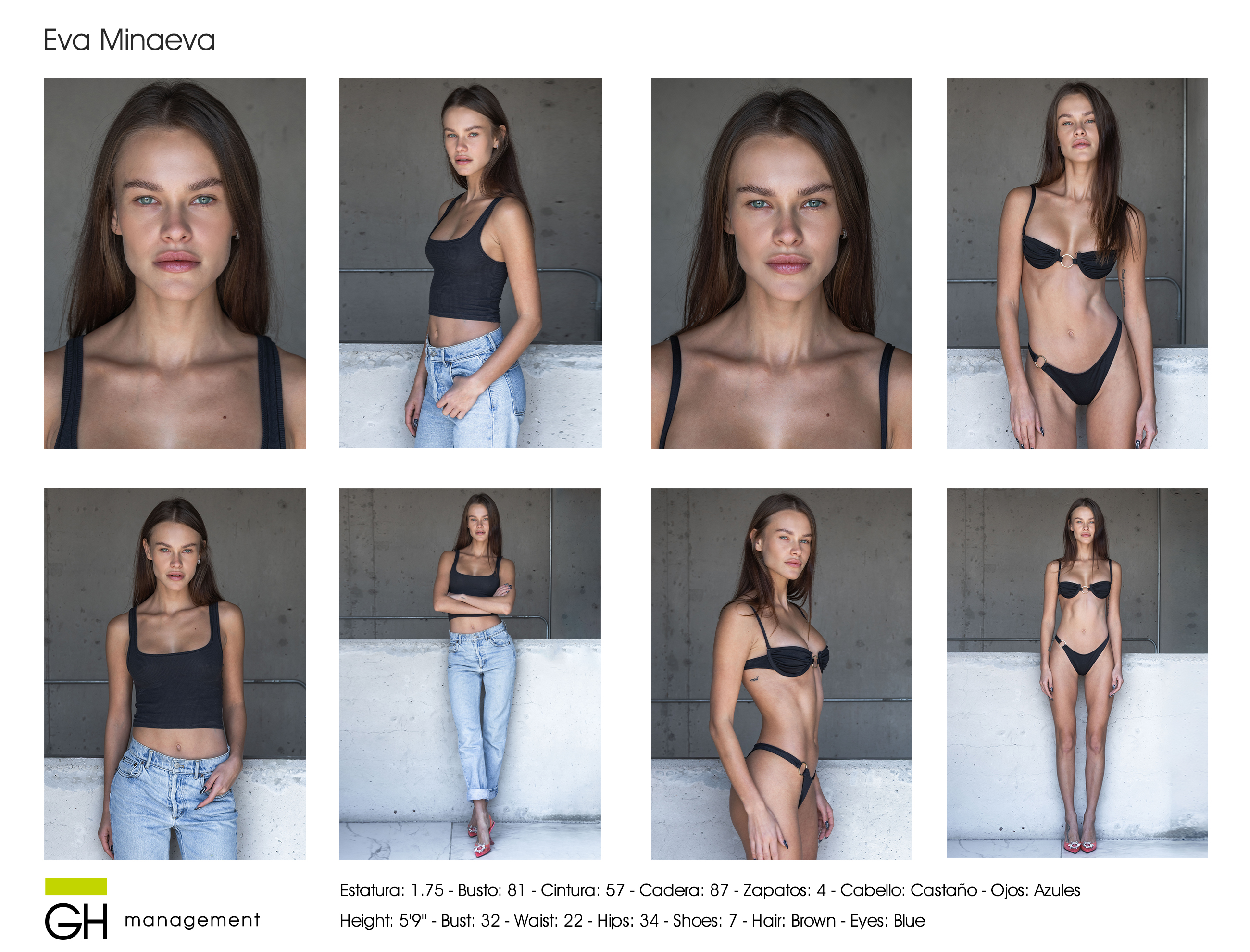 Estatura: 1.75 - Busto: 81 - Cintura: 57 - Cadera: 87 - Zapatos: 4 - Cabello: CastaƱo - Ojos: Azules