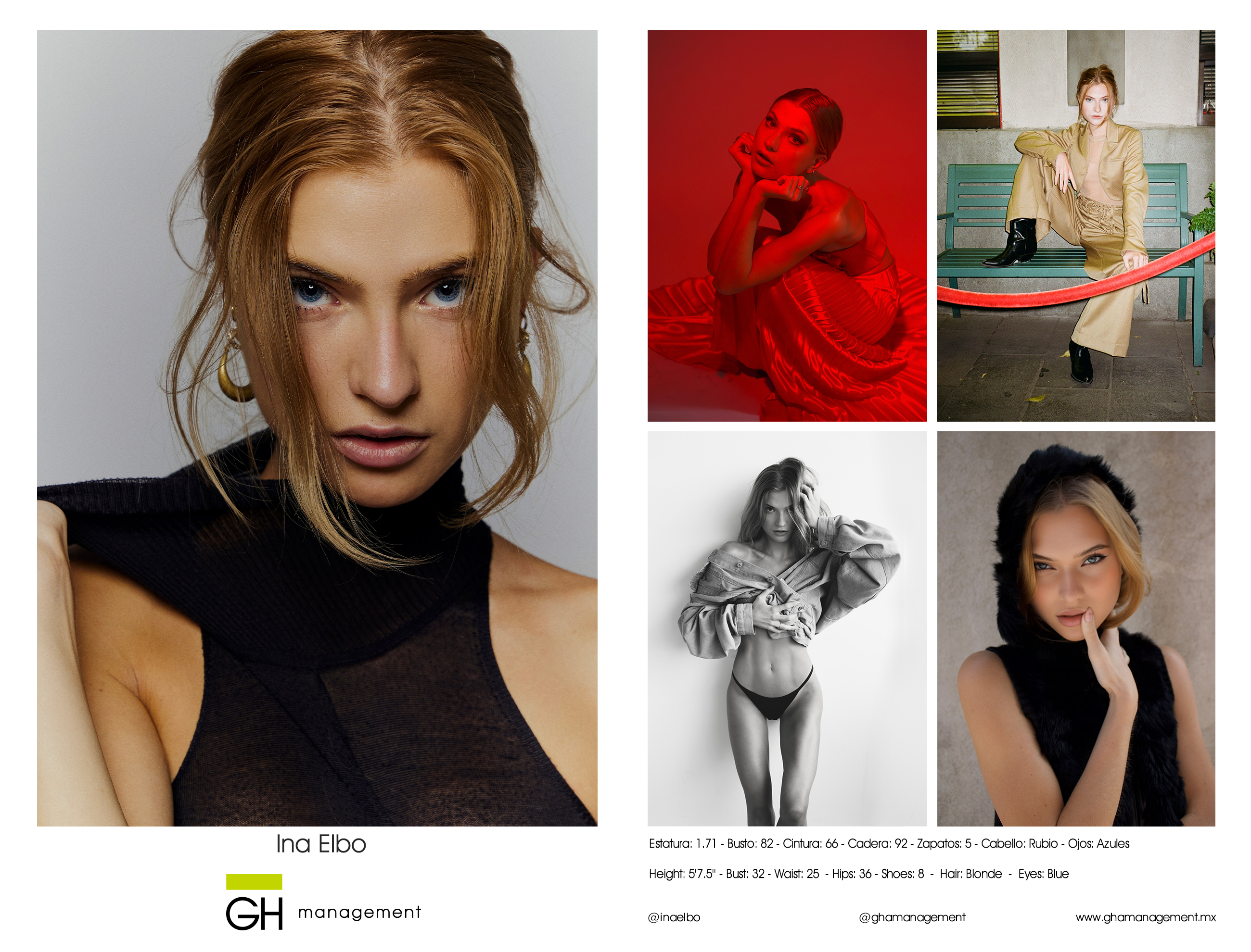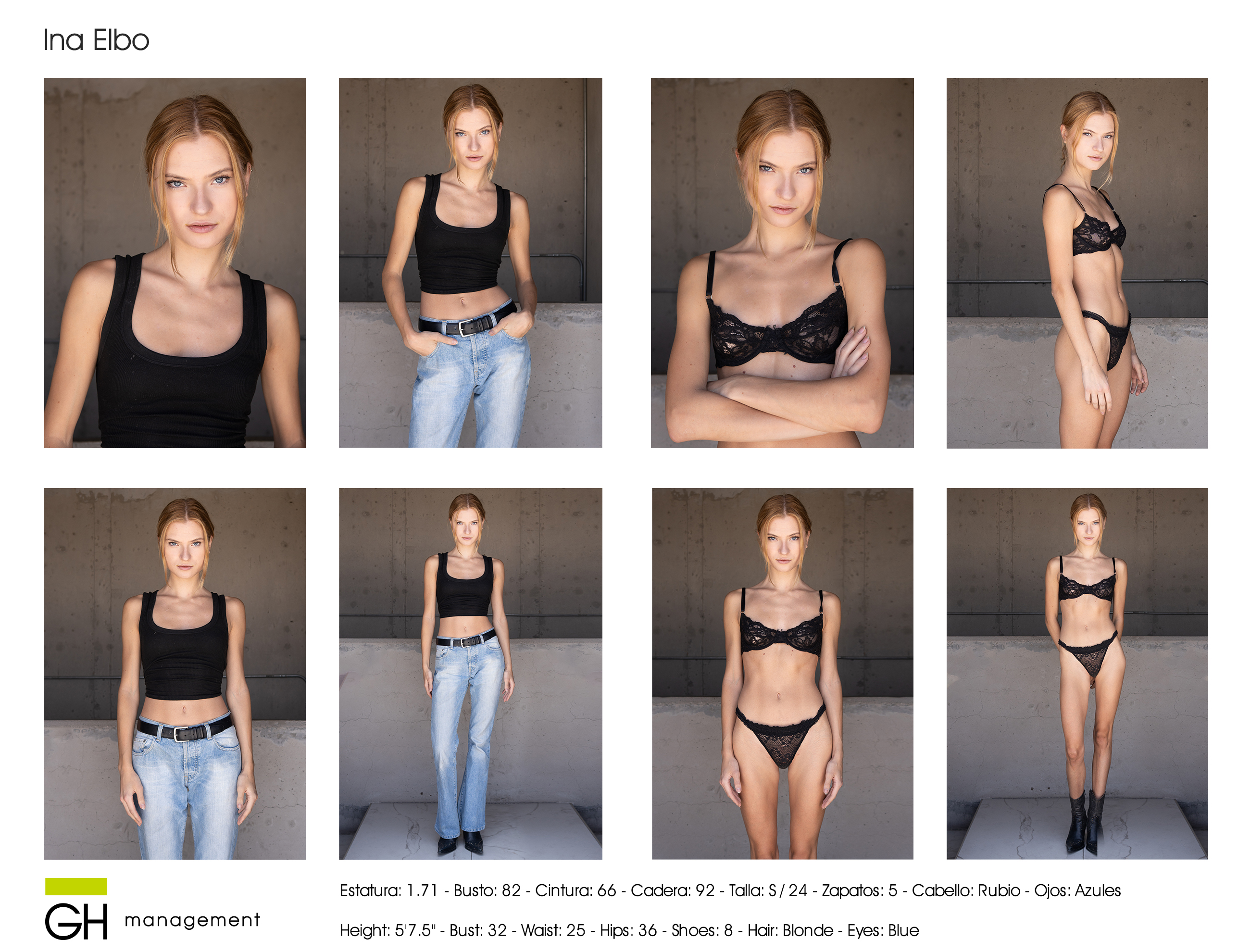 Estatura 1.71 - Busto 82 - Cintura 66 - Cadera 92 - Zapato 5 - Cabello Rubio - Ojos Azules