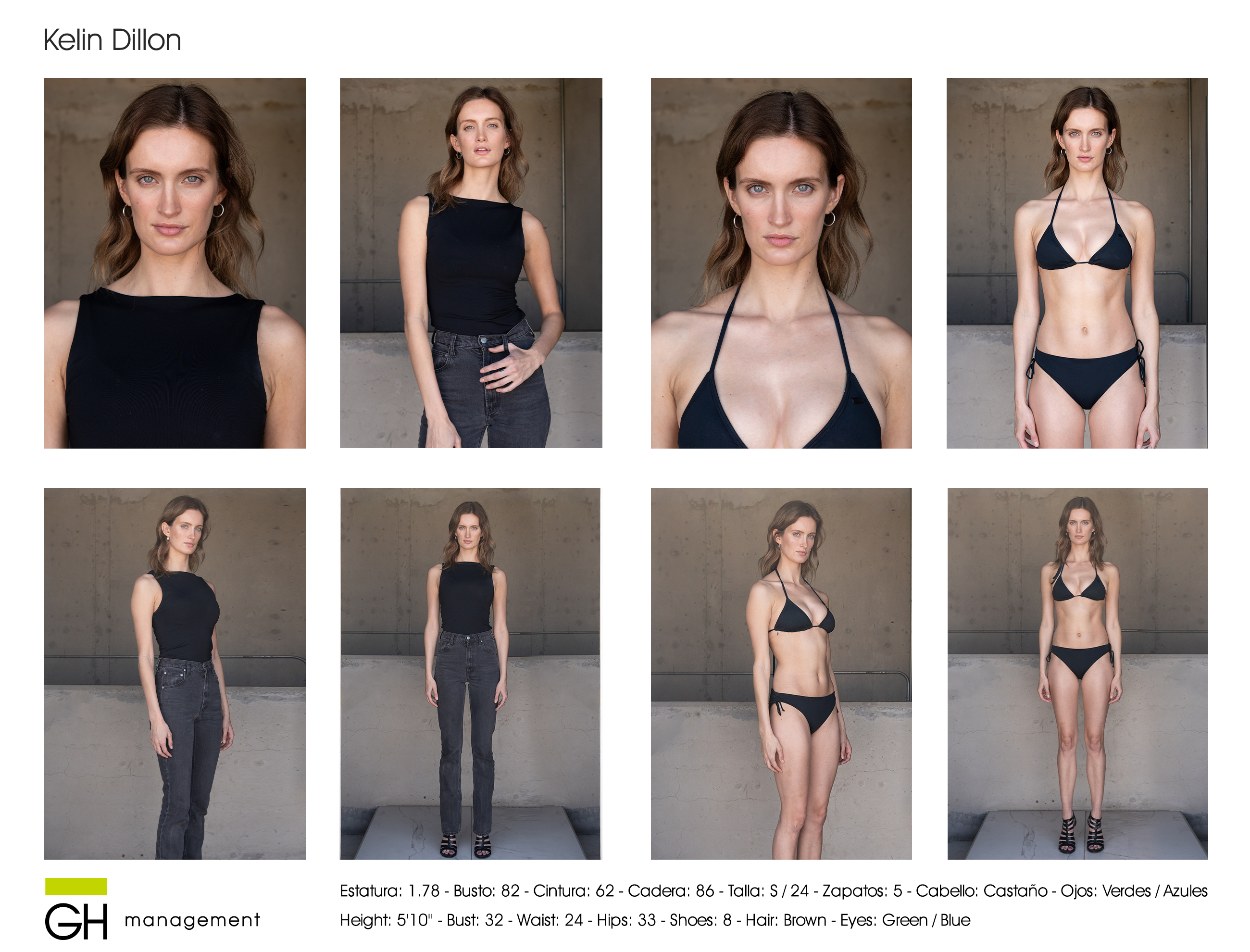 Estatura: 1.78 - Busto: 82 - Cintura: 62 - Cadera: 86 - Zapatos: 5 - Cabello: CastaƱo - Ojos: Verdes / Azules