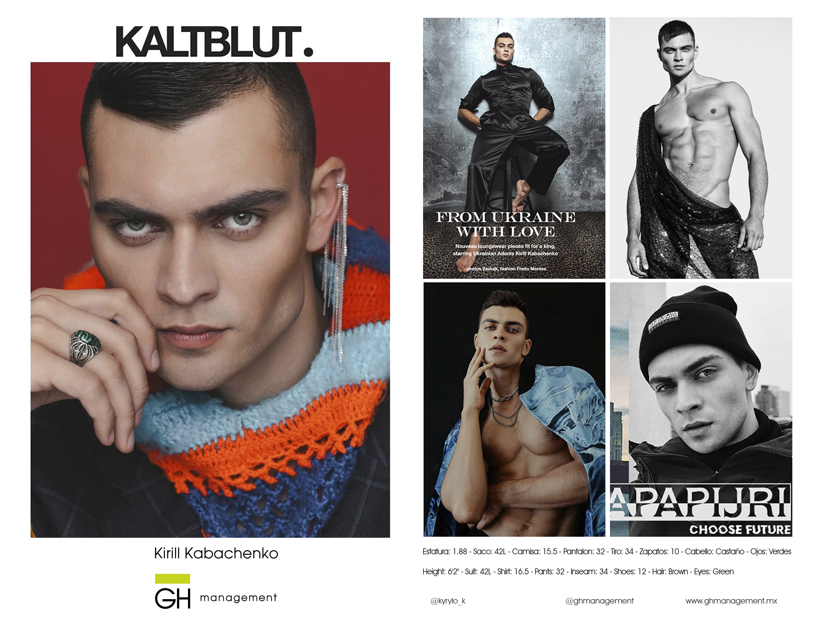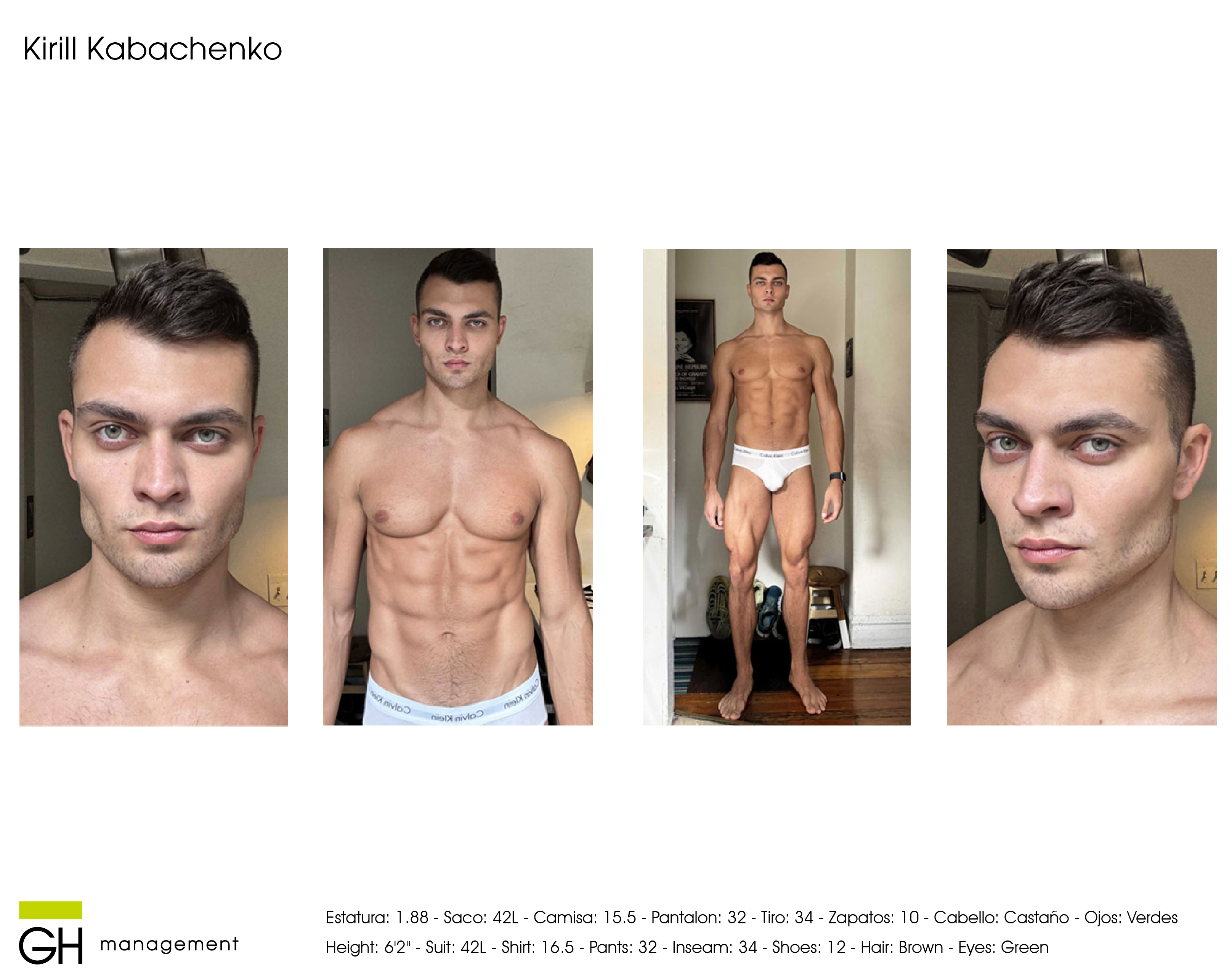 Estatura: 1.88 - Saco: 42L - Camisa: 15.5 - Pantalon: 32 - Tiro: 34 - Zapatos: 10 - Cabello: CastaƱo - Ojos: Verdes