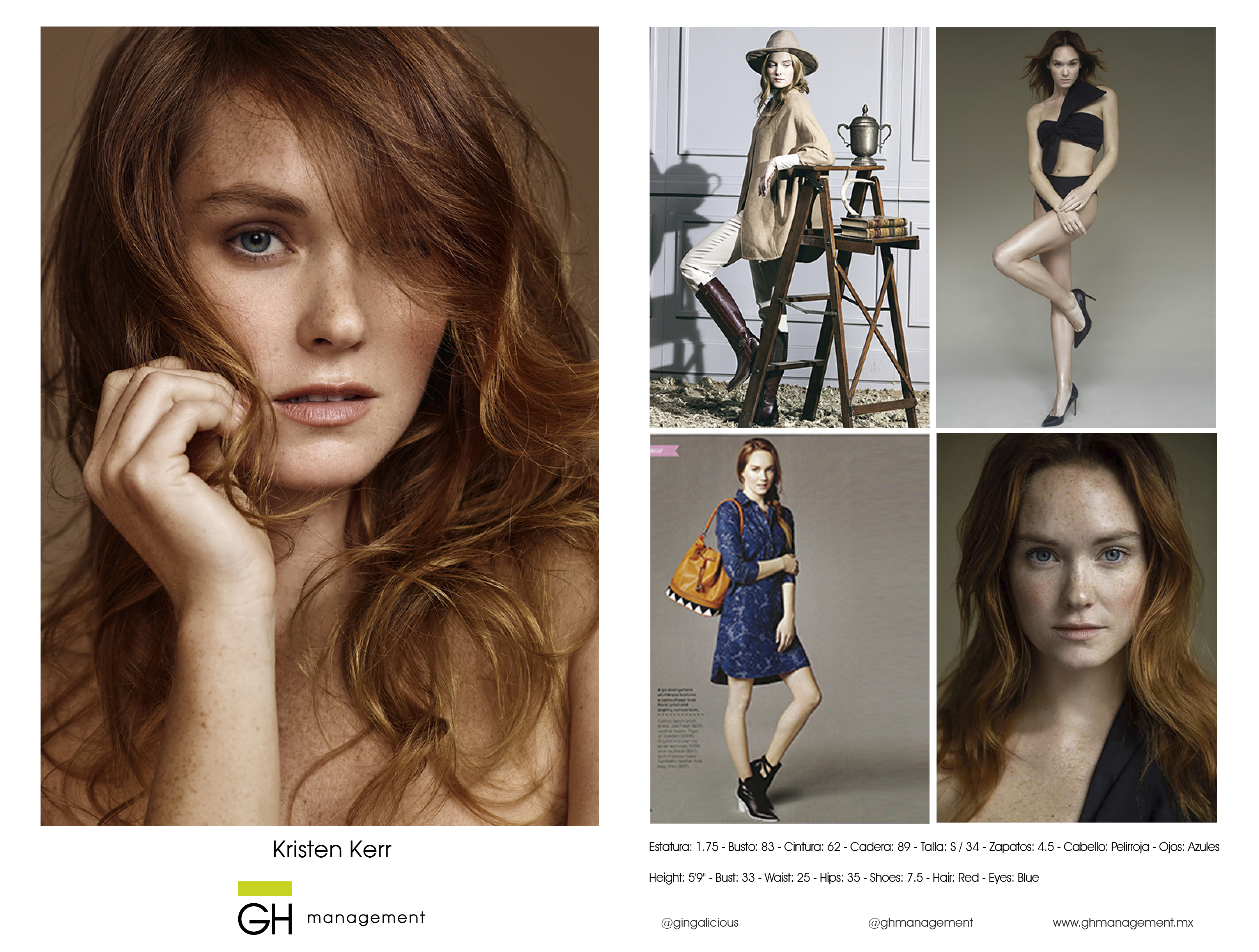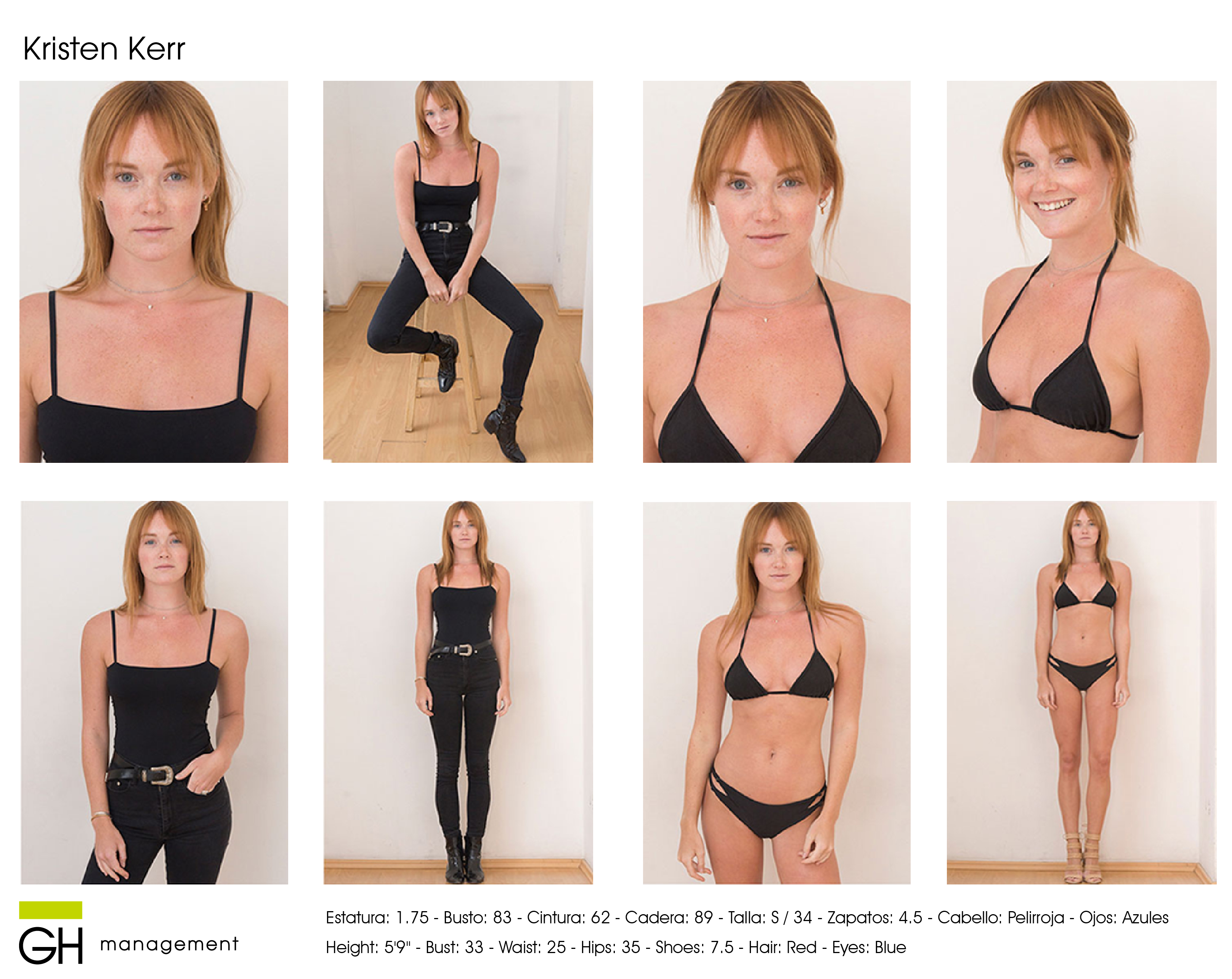 Estatura: 1.75 - Busto: 83 - Cintura: 62 - Cadera: 89 - Zapatos: 4.5 - Cabello: Pelirroja - Ojos: Azules