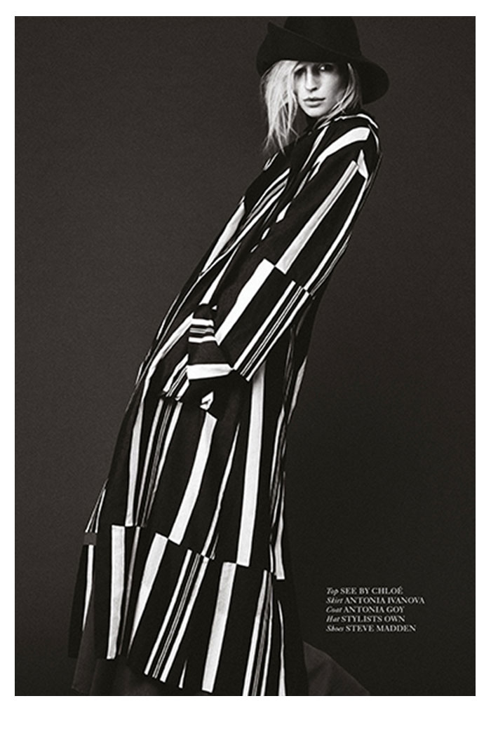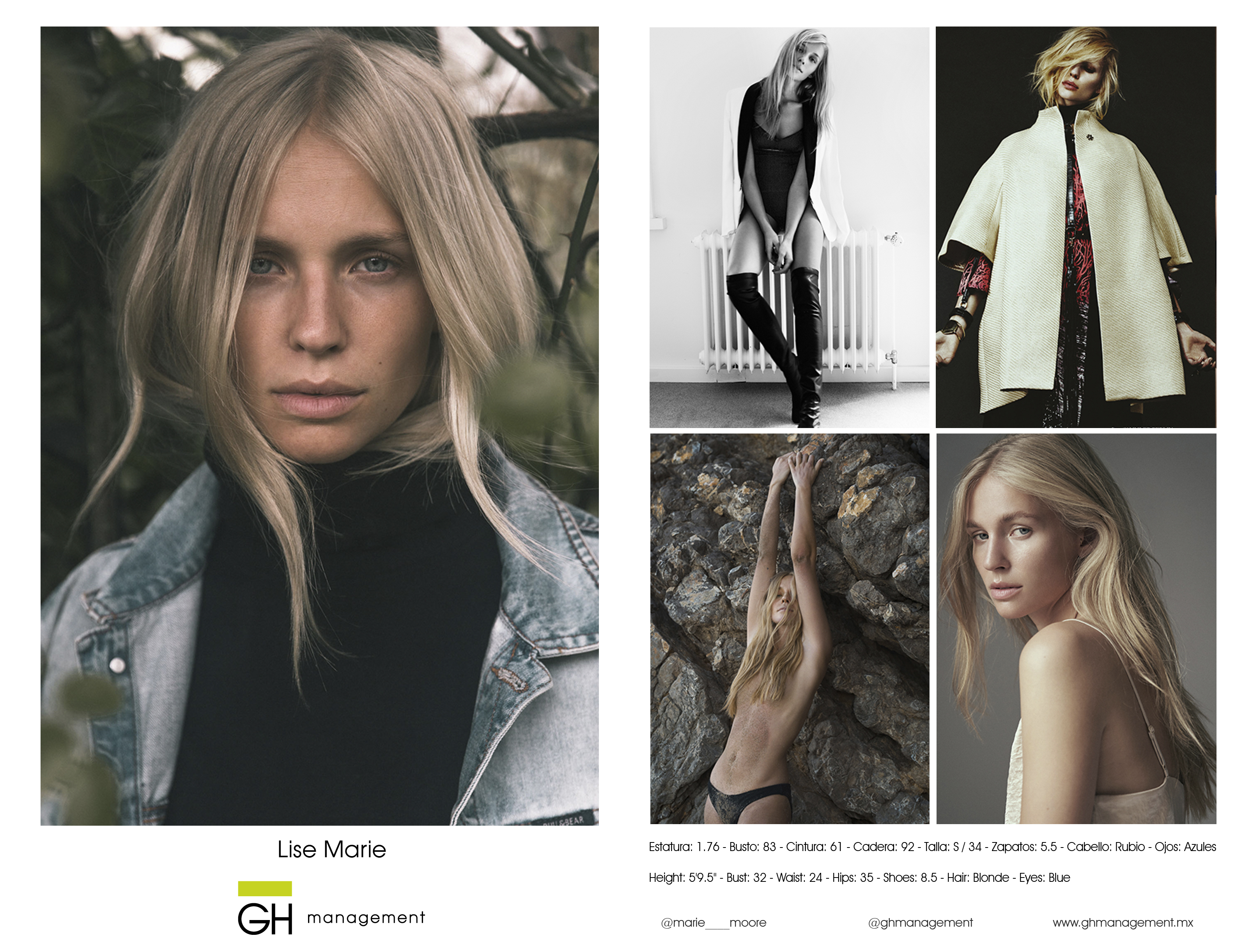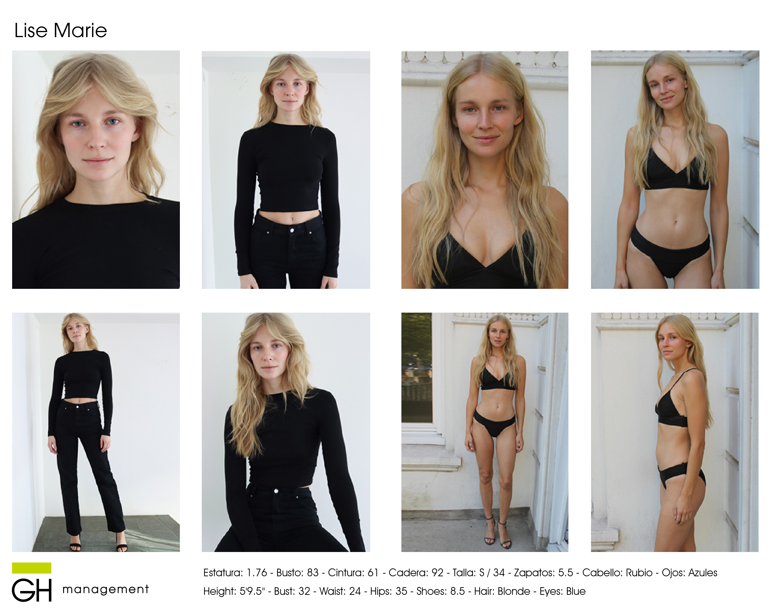 Estatura: 1.76 - Busto: 83 - Cintura: 61 - Cadera: 92 - Zapatos: 5.5 - Cabello: Rubio - Ojos: Azules