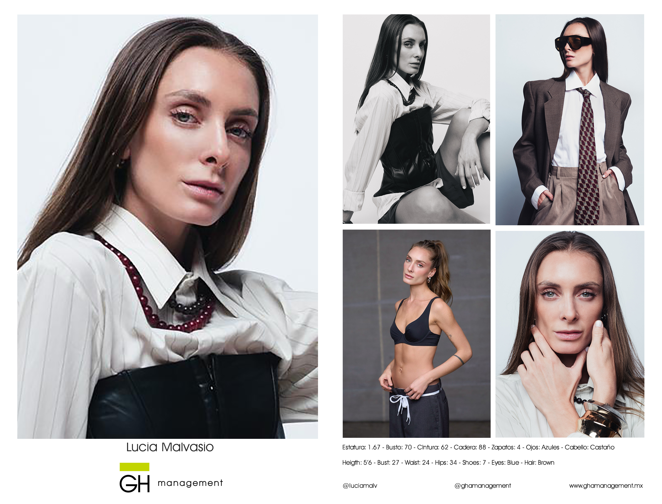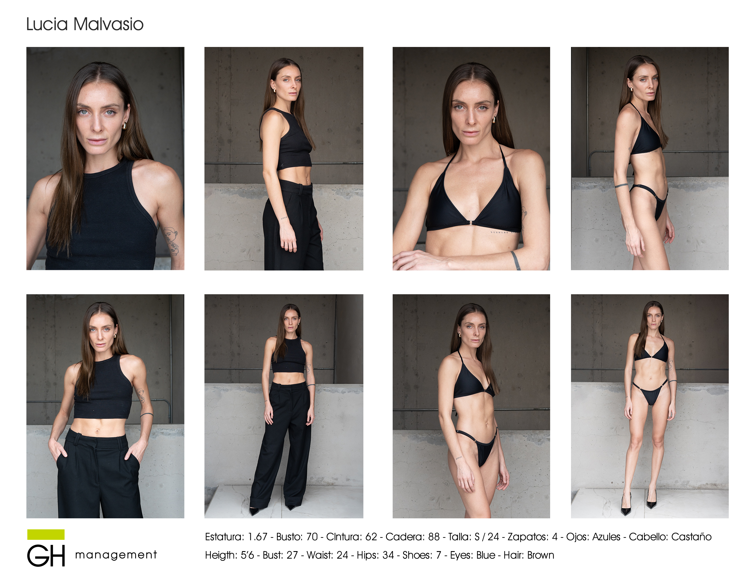 Heigth: 5’6 - Bust: 27 - Waist: 24 - Hips: 34 - Shoes: 7 - Eyes: Blue - Hair: Brown