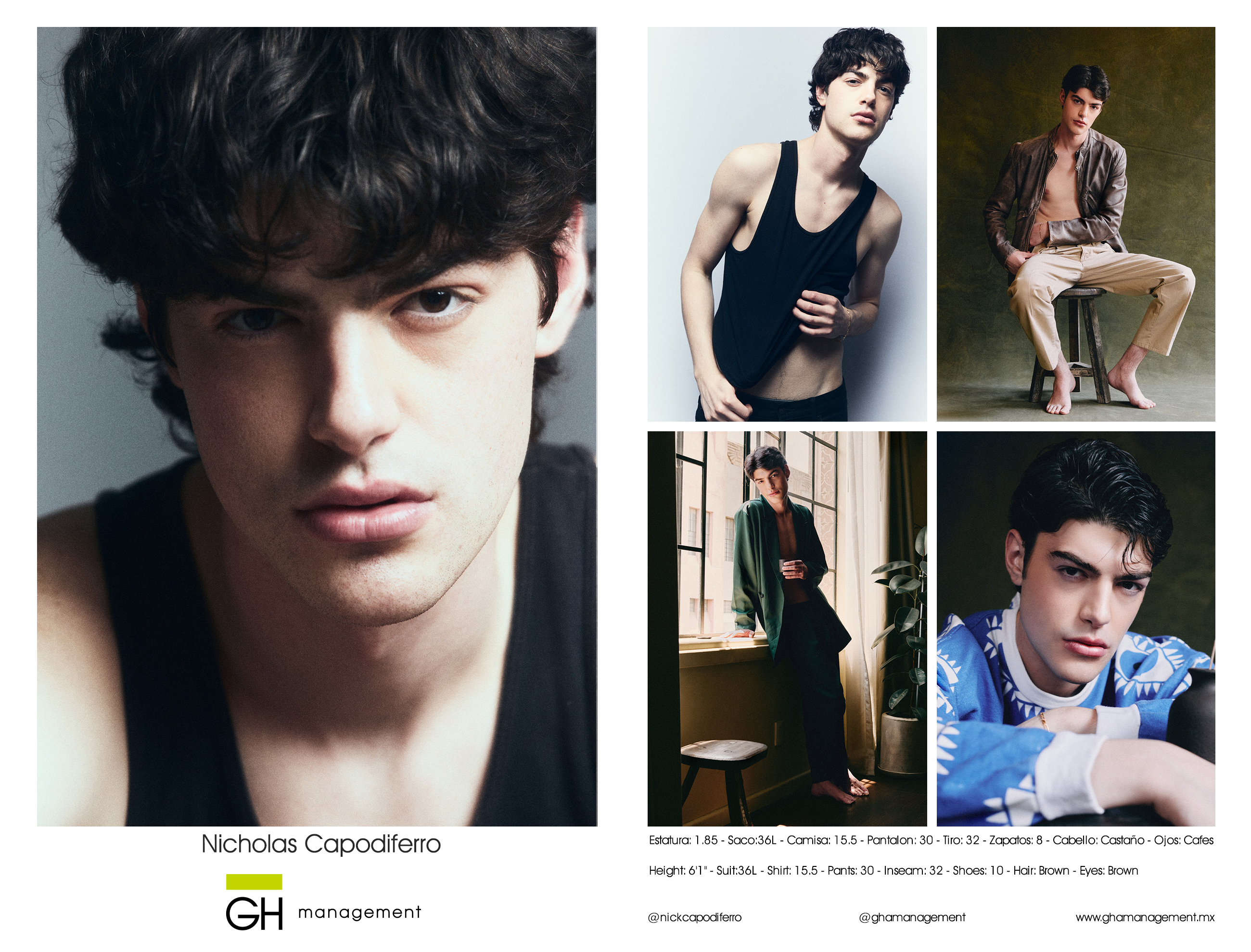 Estatura: 1.85 - Saco:36L - Camisa: 15.5 - Pantalon: 30 - Tiro: 32 - Zapatos: 8 - Cabello: CastaƱo - Ojos: Cafes
