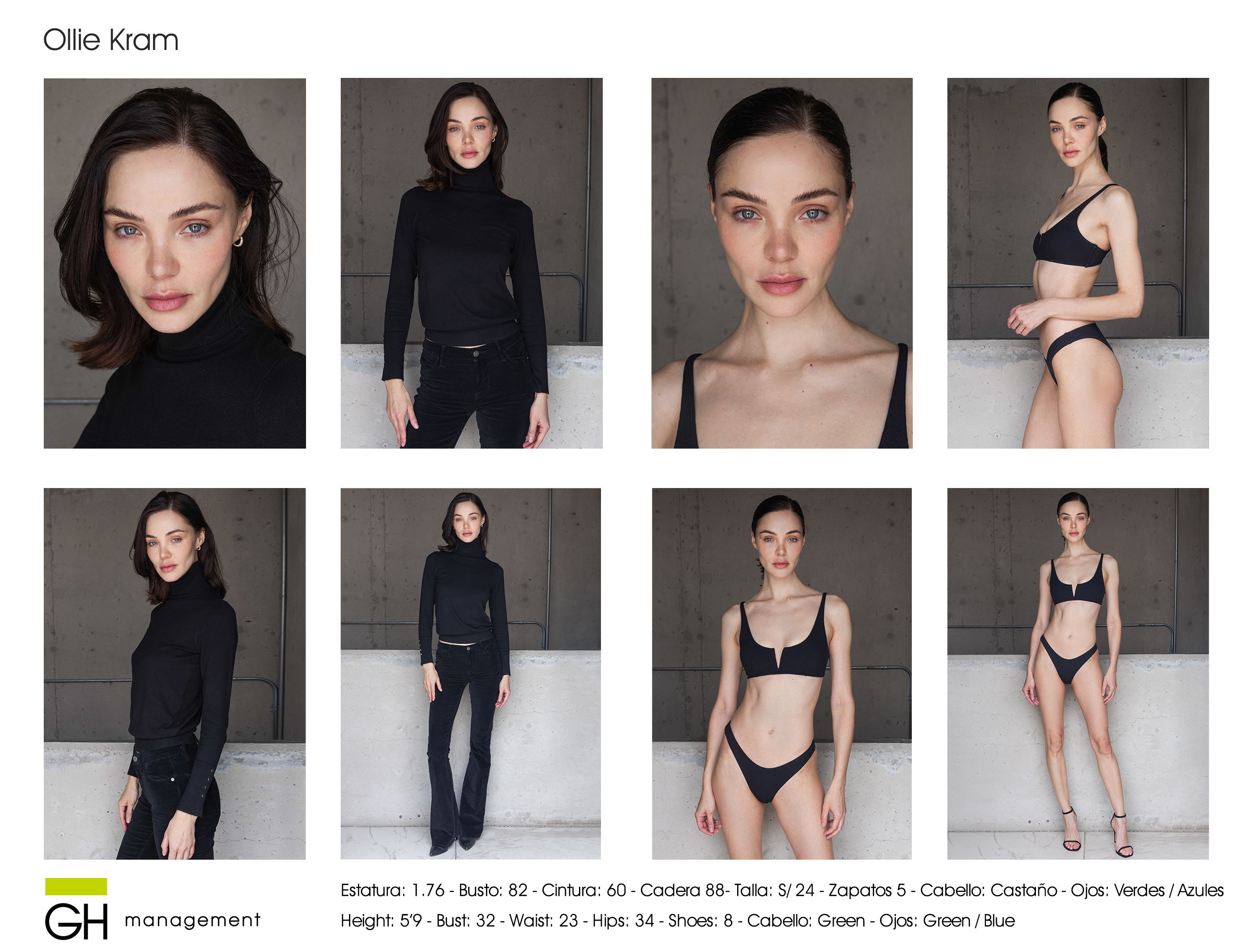 Estatura: 1.76 - Busto: 82 - Cintura: 60 - Cadera 88 - Zapatos 5 - Cabello: Castaño - Ojos: Verdes / Azules