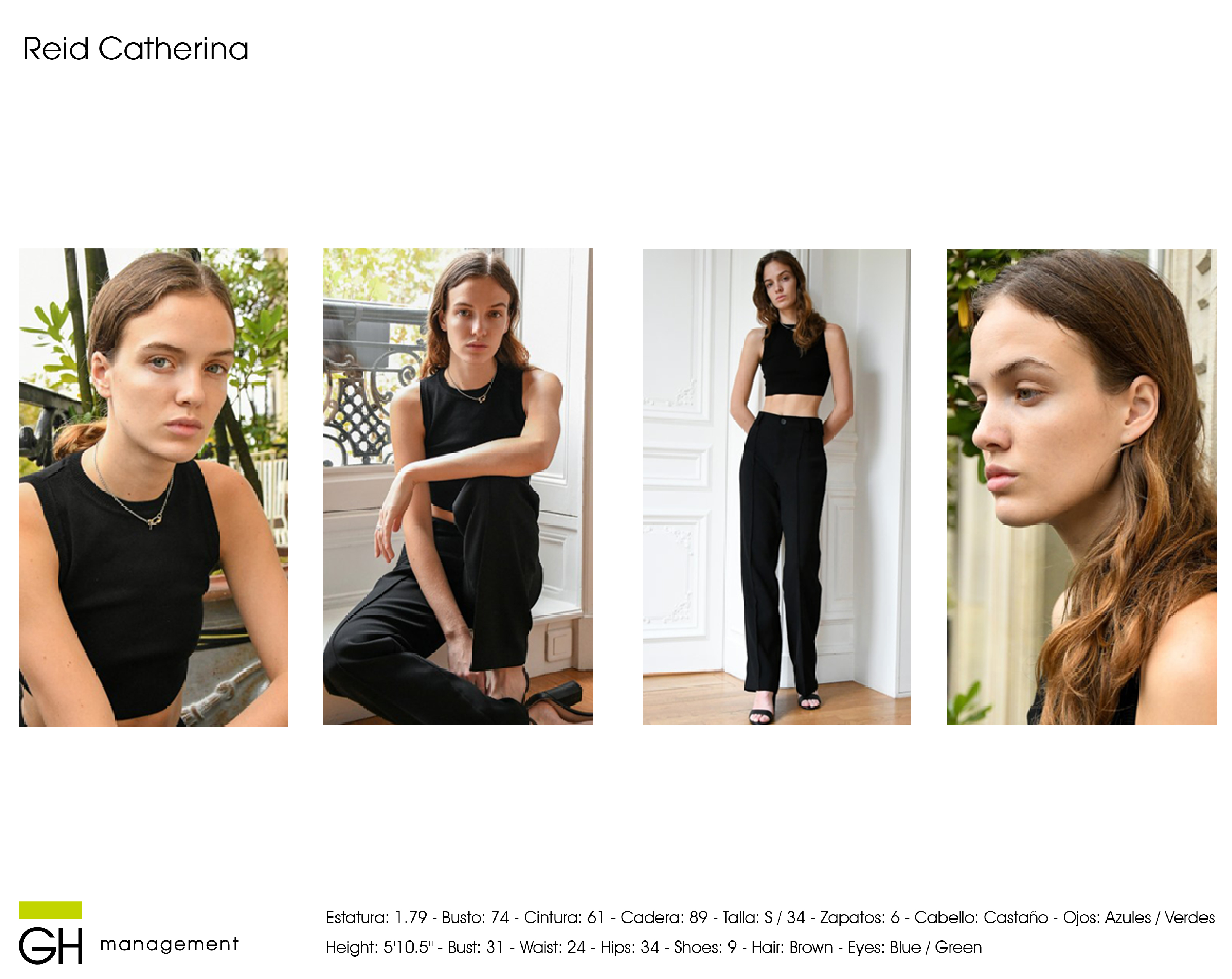 Estatura: 1.79 - Busto: 74 - Cintura: 61 - Cadera: 89 - Zapatos: 6 - Cabello: CastaƱo - Ojos: Azules / Verdes