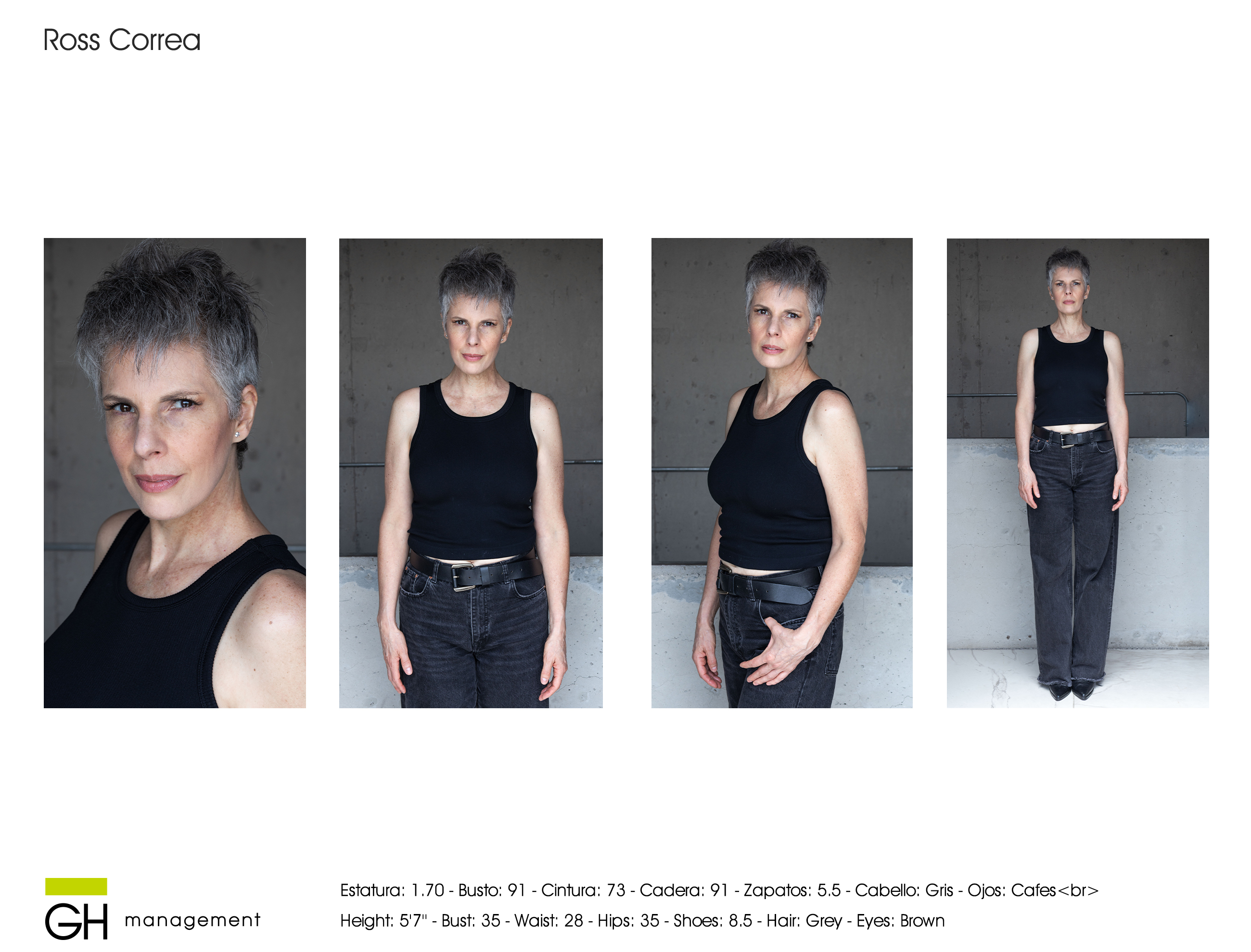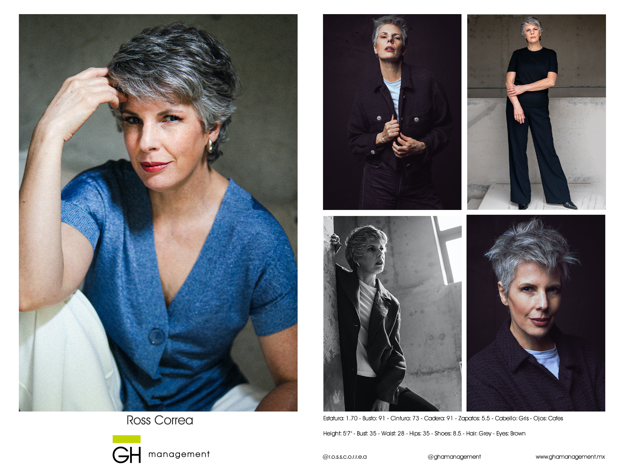 Estatura: 1.70 - Busto: 91 - Cintura: 73 - Cadera: 91 - Zapatos: 5.5 - Cabello: Gris - Ojos: Cafes