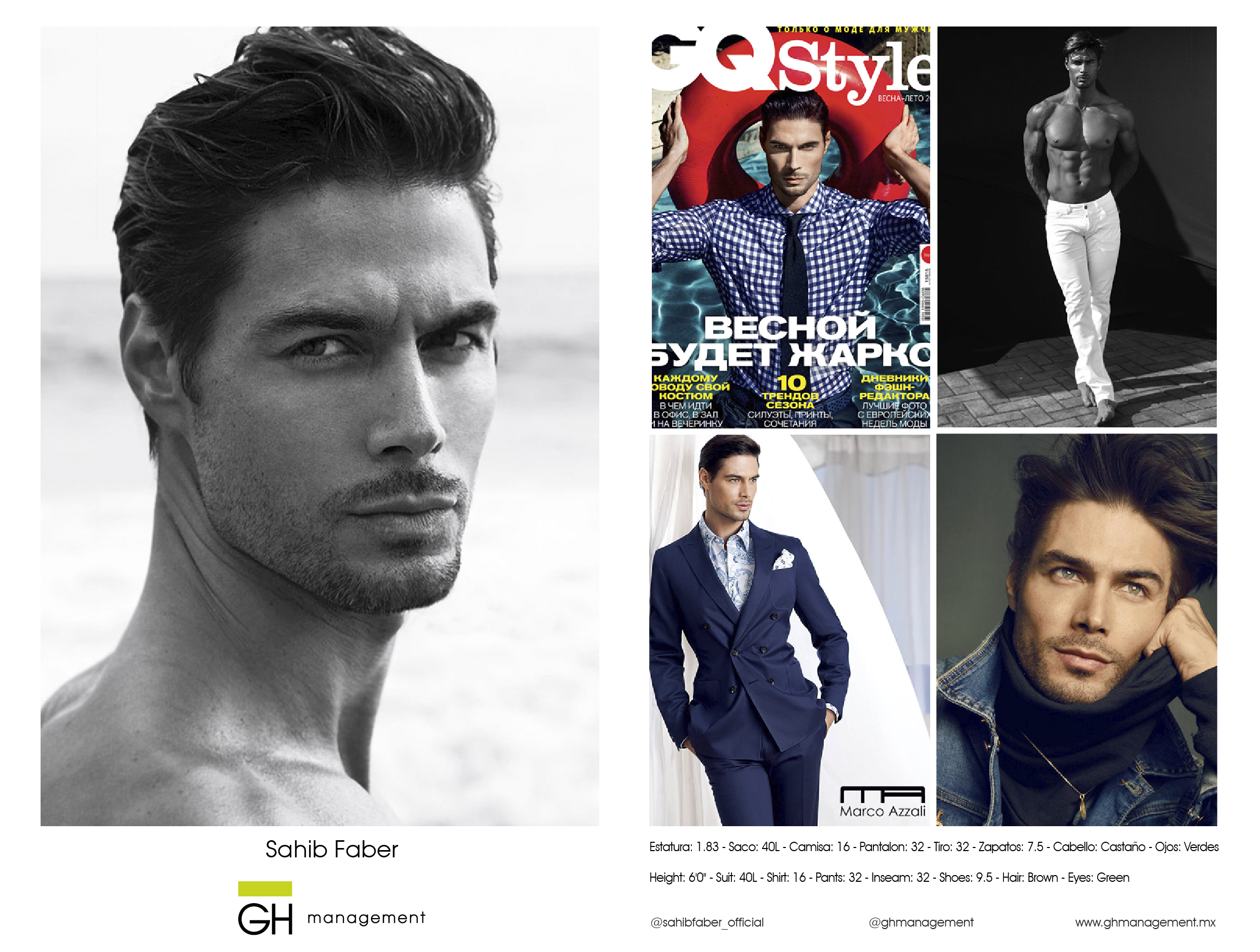 Estatura: 1.83 - Saco: 40L - Camisa: 16 - Pantalon: 32 - Tiro: 32 - Zapatos: 7.5 - Cabello: CastaƱo - Ojos: Verdes