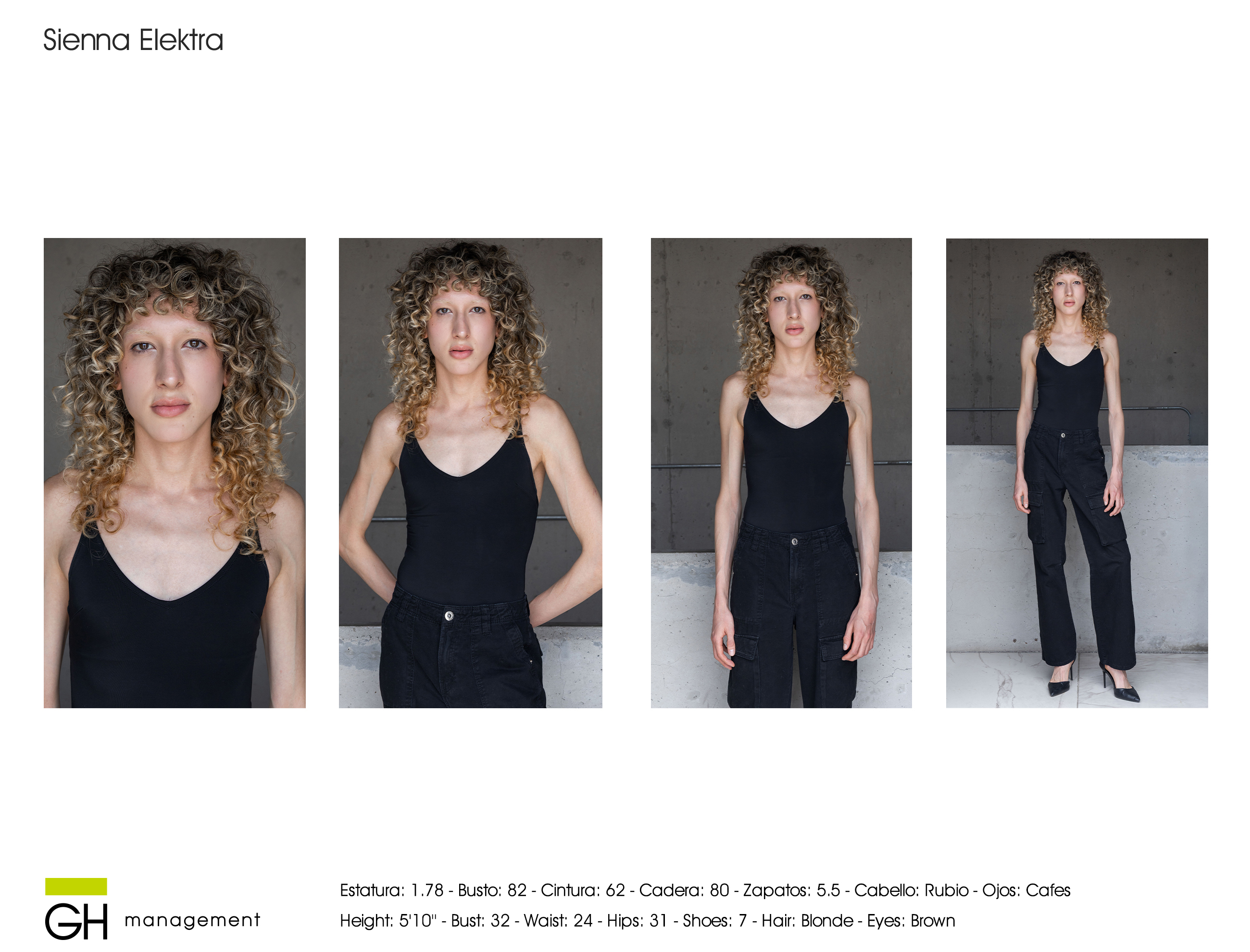 Estatura: 1.78 - Busto: 82 - Cintura: 62 - Cadera: 80 - Zapatos: 5.5 - Cabello: Rubio - Ojos: Cafes